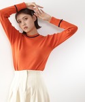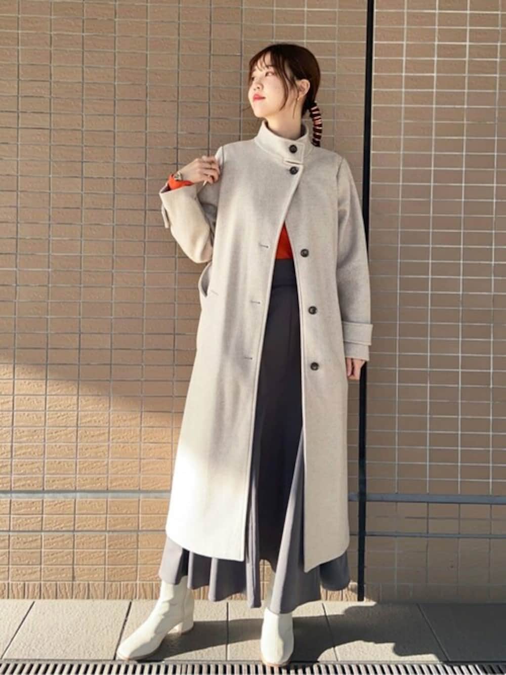 一着でこなれ感の出るテックメルトンコートとカラーニットのコーデです♡ コートの中に、トレンドのオレンジニットを差し色で入れることで、マンネリしがちな冬のコーディネートがとても華やかになります! コートは丈感が少し長めですが、スッキリとしたシルエットで重たい印象にもならず、どの身長の方にもおすすめです☺︎