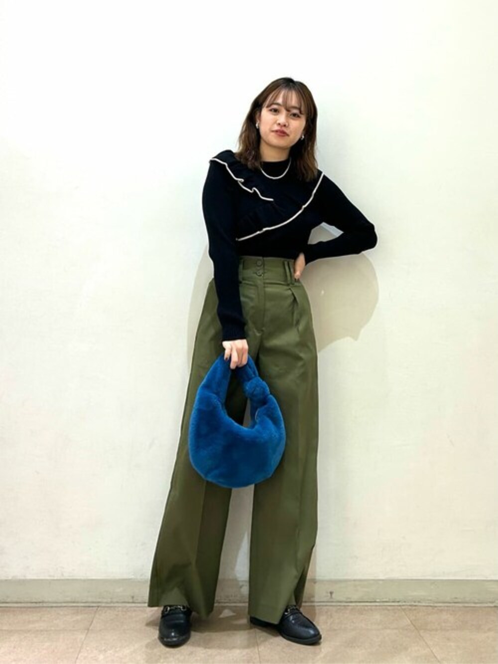 フリルがポイントのコンパクトニット。甘めになりがちなフリルもカーキ合わせやパンツスタイリングだとカジュアルな印象になります。ボトムスにインをするとメリハリがあるスタイルに仕上がりますよ♪