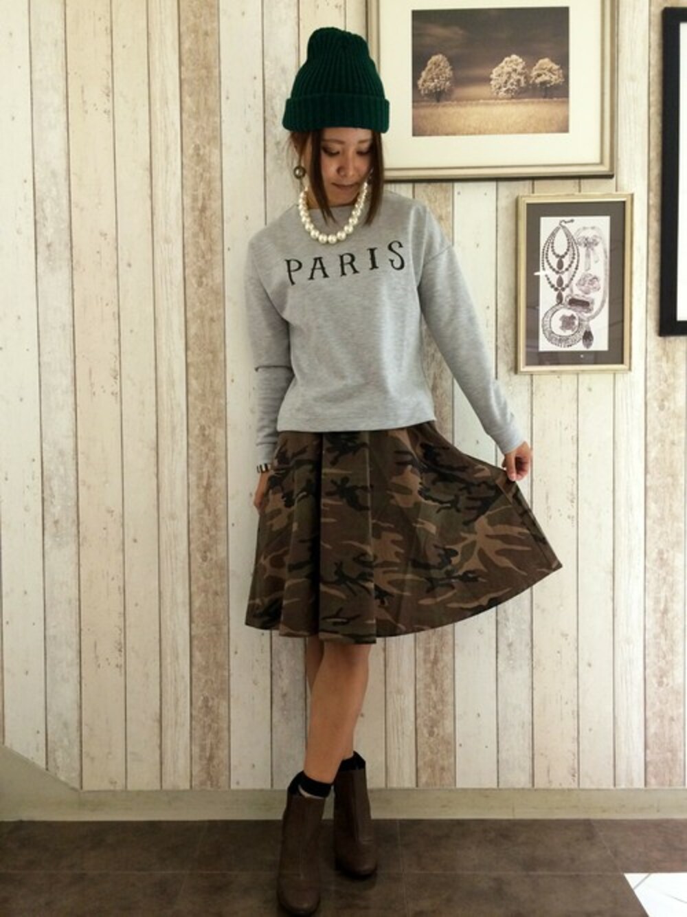 カモフラスカートにトレンドのロゴスウェット。ニット帽でクラスアップしたカジュアルコーデを、パールネックレスではずして♪