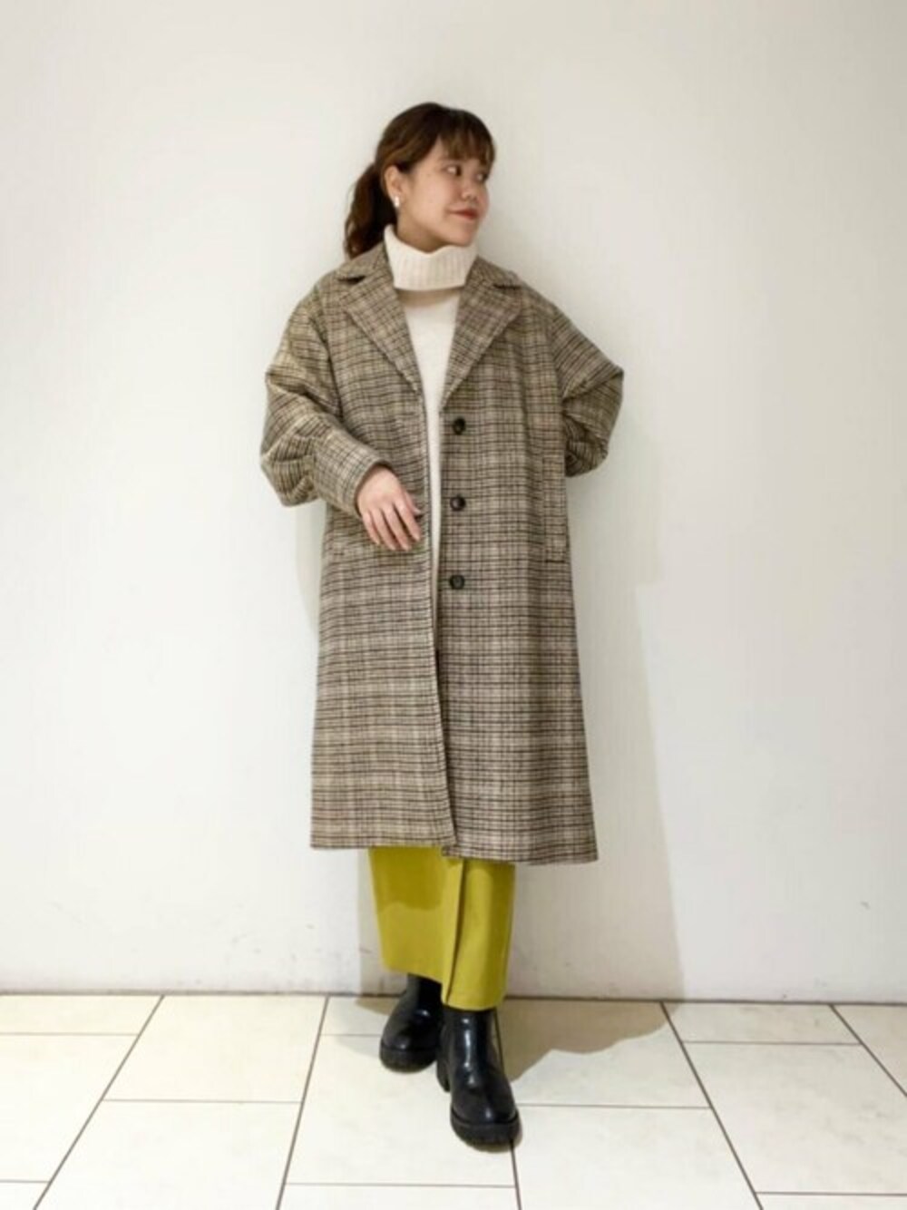 チェックのコートは、袖にタックが入っているのでボリュームがあって可愛いシルエットです♡インナーのニットはお尻がしっかりと隠れる丈なので、腰回りをカバーしてくれて安心です☺︎タイトスカートは前にスリットが入っているので、足が綺麗に見えるデザインです!