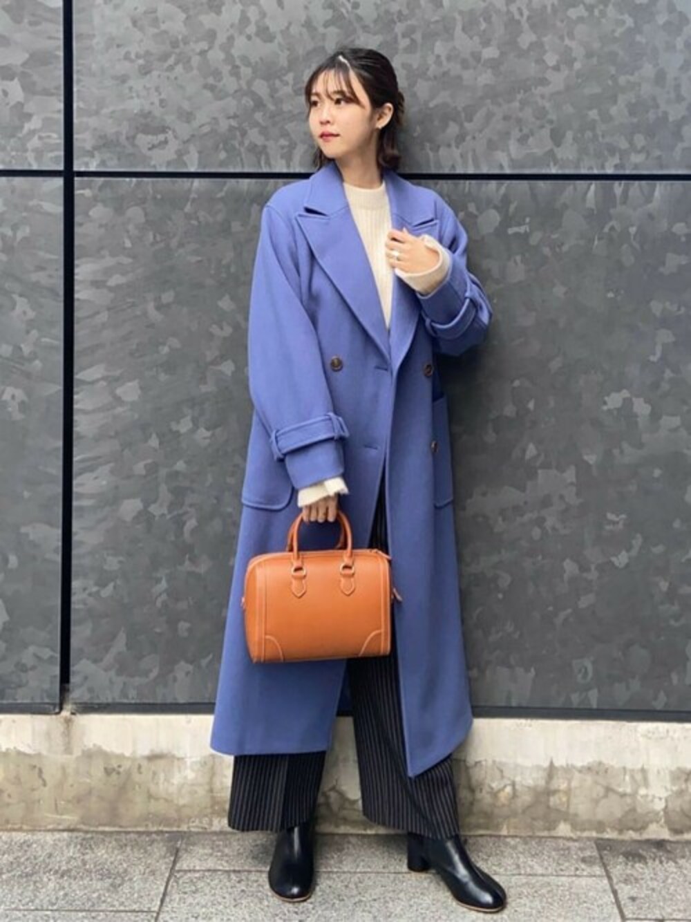 ブルーのコートとパンツの綺麗目カジュアルコーデです♡ アームが広めなので、しっかり着込んでも窮屈感なくお召し頂けます。 パンツはストライプ柄で足長効果も抜群です◎ **身長:166cm/骨格:ウェーブ/パーソナルカラー:イエベ秋**