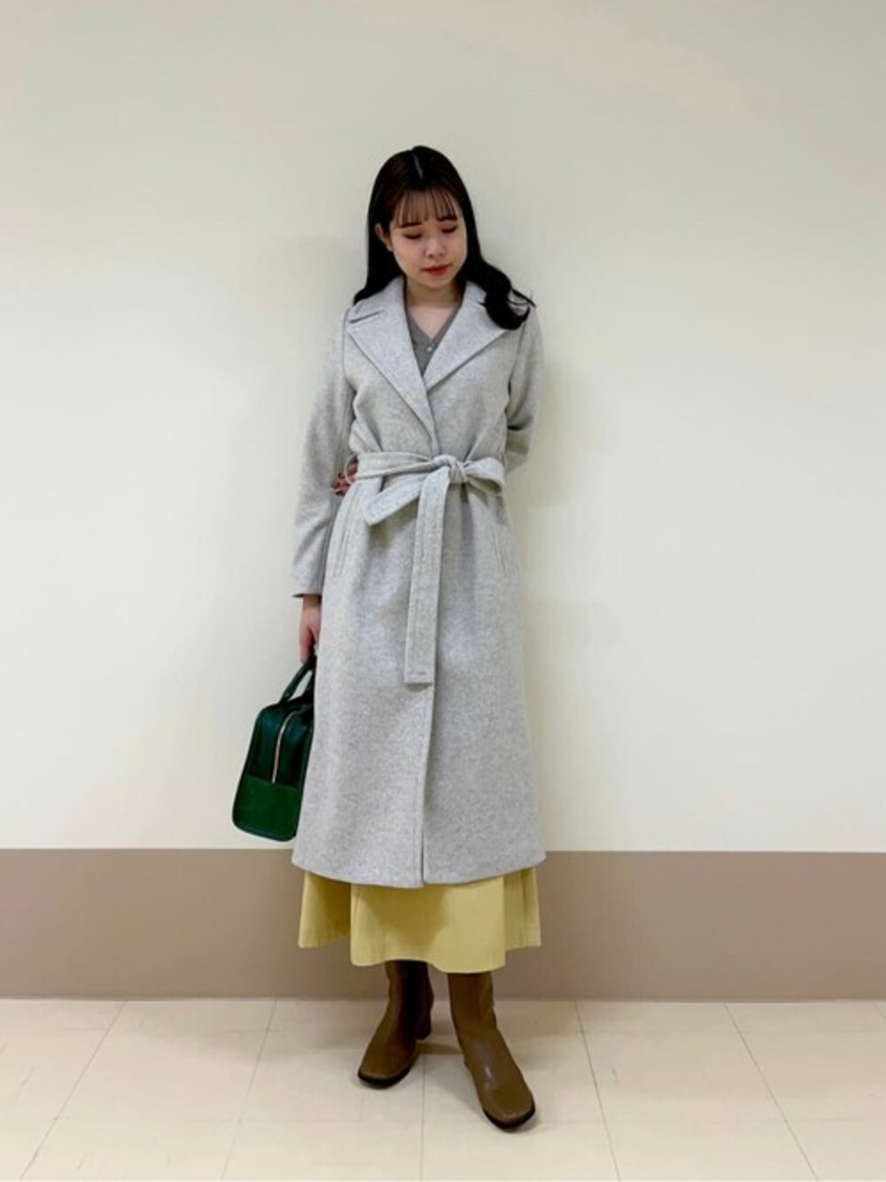 【春色コーデ】ハリ感のあるスカートとアシンメトリーな切り替えがポイントに、柔らかいイエローが可愛いです!ウエストがすっきりオンオフ使えるアイテムです!大人っぽいデザインのコートも春先まで使えるオススメアイテムです!