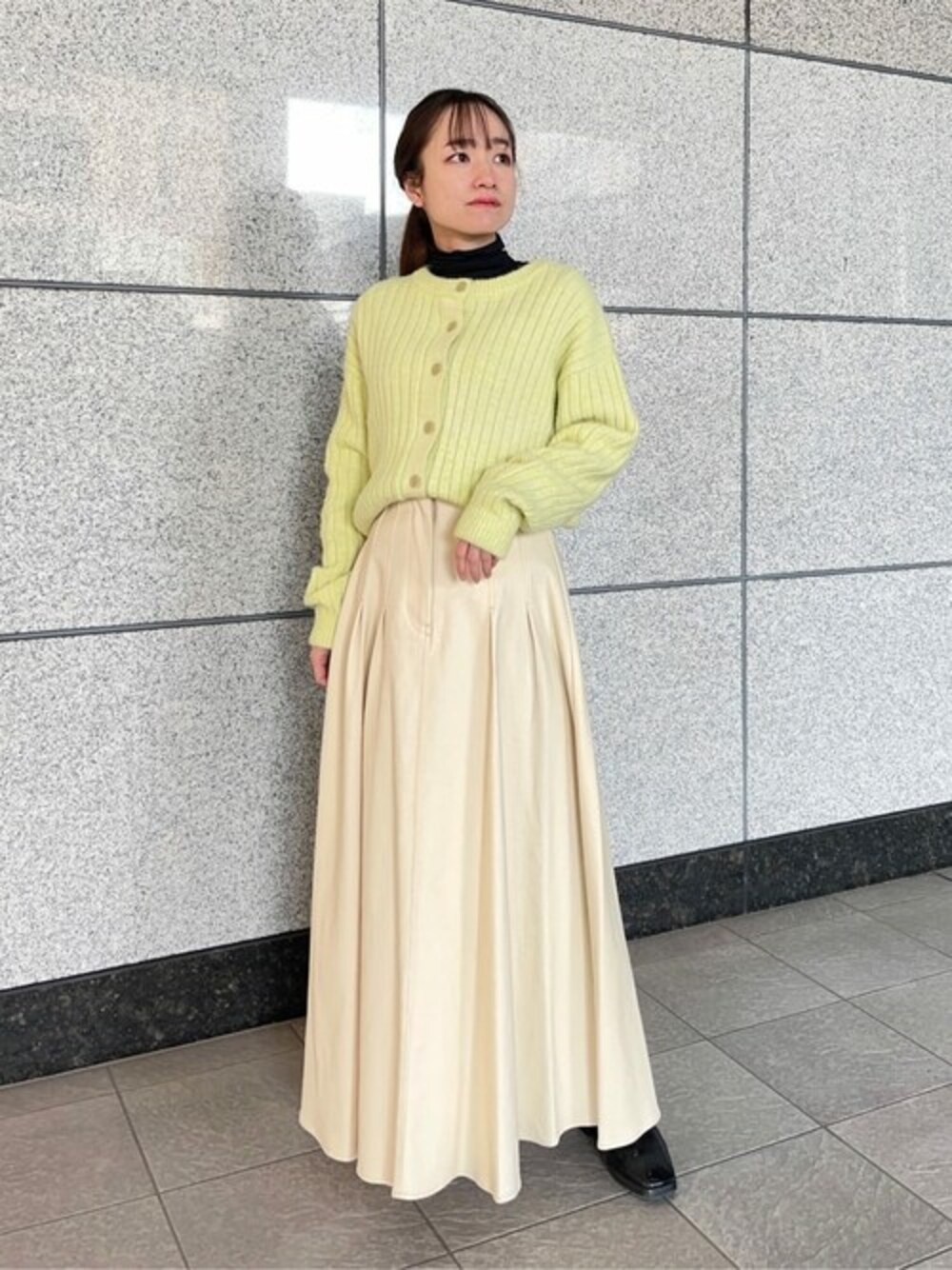 今すぐ着られるほんのり春を意識したコーディネートです♪カーディガンとスカートが淡くフェミニンなので、インナーとブーツをブラックにして全体を引き締めました☺︎