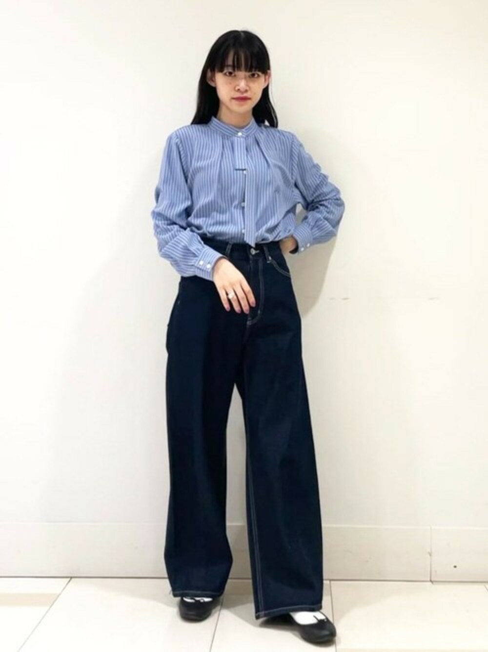 カーブしたシルエットが骨盤から足先までのラインを綺麗に見せてくれる優秀デニム。 トップスはベーシックなブラウスを取り入れれば女性らしく品良いスタイリングに。 春先はジャケット合わせもおすすめです☺︎