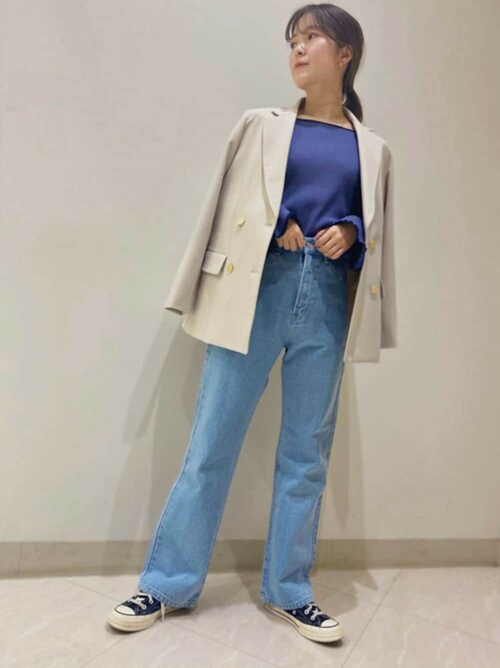 春カラーのデニムにジャケット合わせで大人カジュアルコーデにしてみました︎︎☺︎ インナーはブルーを入れ全体的に爽やかな印象に♪ハイウエストの為とにかく足が綺麗に見え脚長効果抜群のデニムです!!! ジャケット→S デニム→M 着用です︎︎☺︎ 20代前半/159cm/イエベ秋