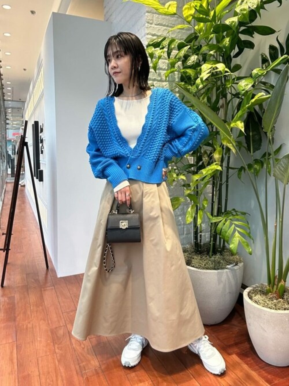 鮮やかなブルーとツイル生地のフレアシルエットが綺麗なスカートにスニーカーを合わせた春のカジュアルスタイル♡ カーディガンはウエストがキュッと絞ってありメリハリが出てかわいいシルエット◎ ポコポコとした立体的な生地感が映える、店頭でも大人気のアイテムです! スカートは張り感があるのでふわっと広がるフレアのフォルムがとっても綺麗に出るので、カジュアルにも綺麗目にも使える優秀ボトムです◎ 160cmでスカートのみSサイズ、その他全てMサイズ着用しています!