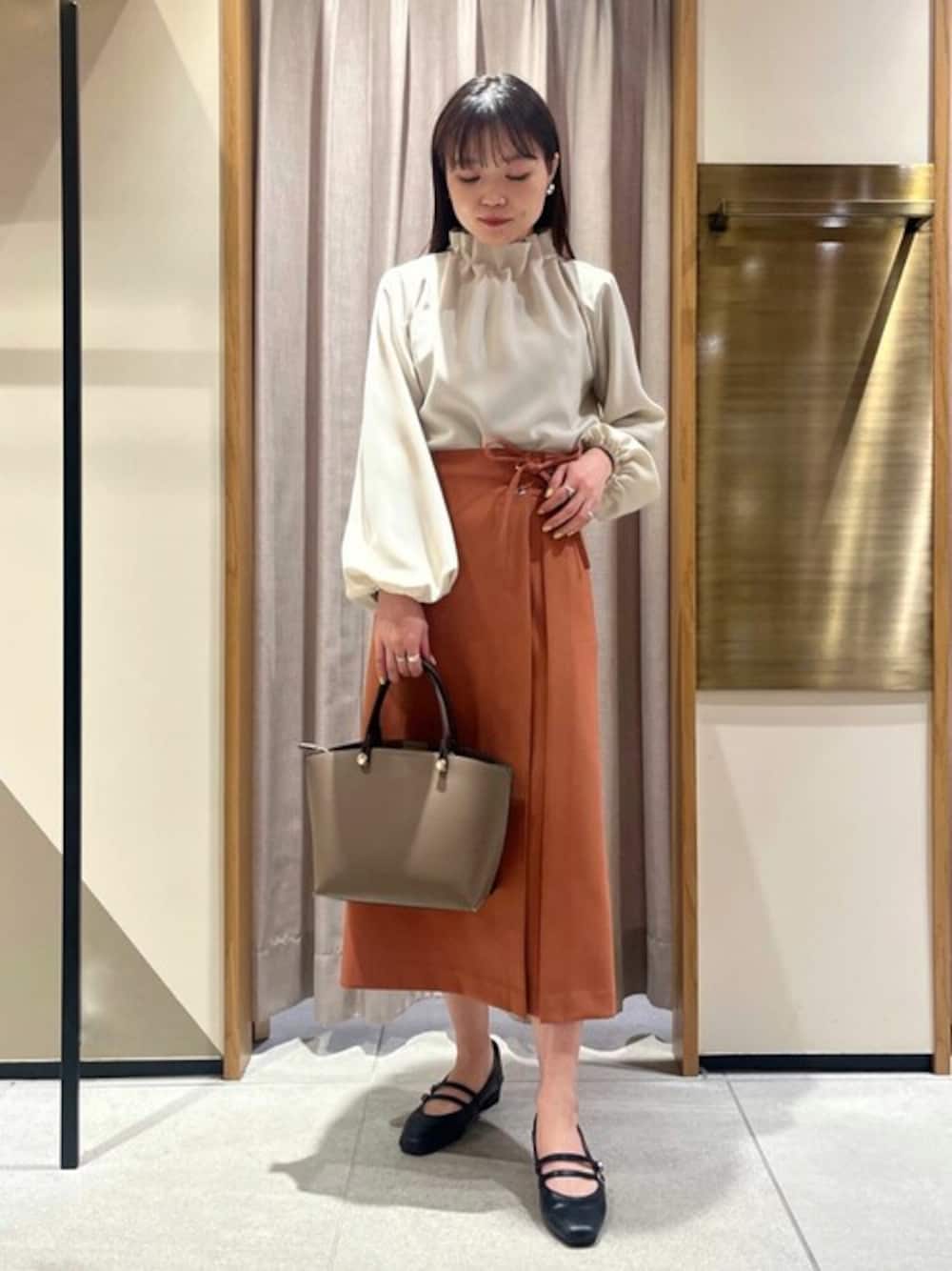 巻きスカート風のタイトスカート♪ タイトスカートいう商品名ですが、裾に向かって柔らかく広がるようなシルエットで骨盤の張りが気になる方にもおすすめです◎ ボトムのシルエットがすっきりしているので、トップスはボリューム感のあるブラウスを合わせました☻***157cm / 骨格ウェーブ / ブルベ夏***
