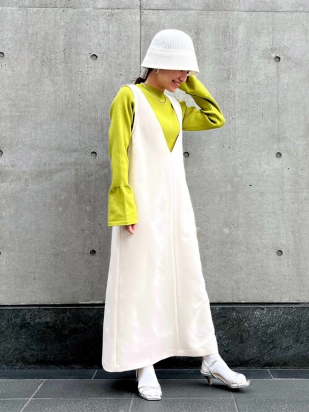 ほんのり広がった袖がかわいいニットと着回し力抜群のジャンスカをコーディネート◎ ニットのカラーが印象的なので他はホワイトでまとめてクリーンに仕上げました♪
