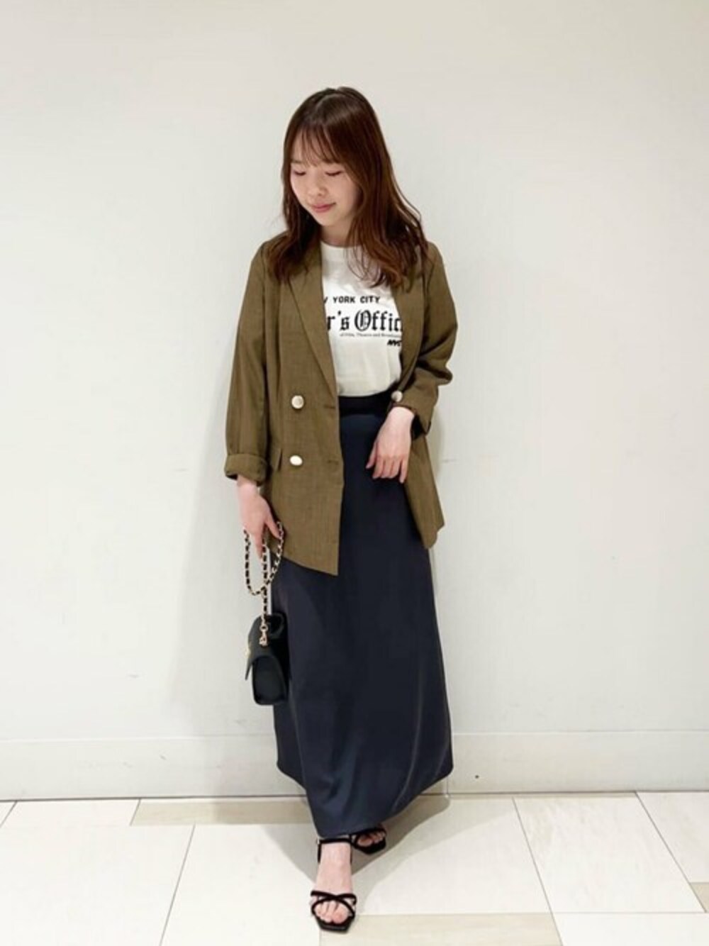 サテンスカートで上品さも残しつつカジュアル見えするスタイリングにしました★スカートのシルエットも広がりすぎずスッキリとお召し頂けます!S.M展開な為、小柄な方でも挑戦しやすいロングスカートでございます。上品な艶感でトップスを変えるだけで幅広い着こなしに!ジャケットは腰回りを覆うくらいの着丈になるので、ロング丈のアイテムとは相性良くお召し頂けます!裏地もなくサラッとしているので、初夏までお使いいただけます!