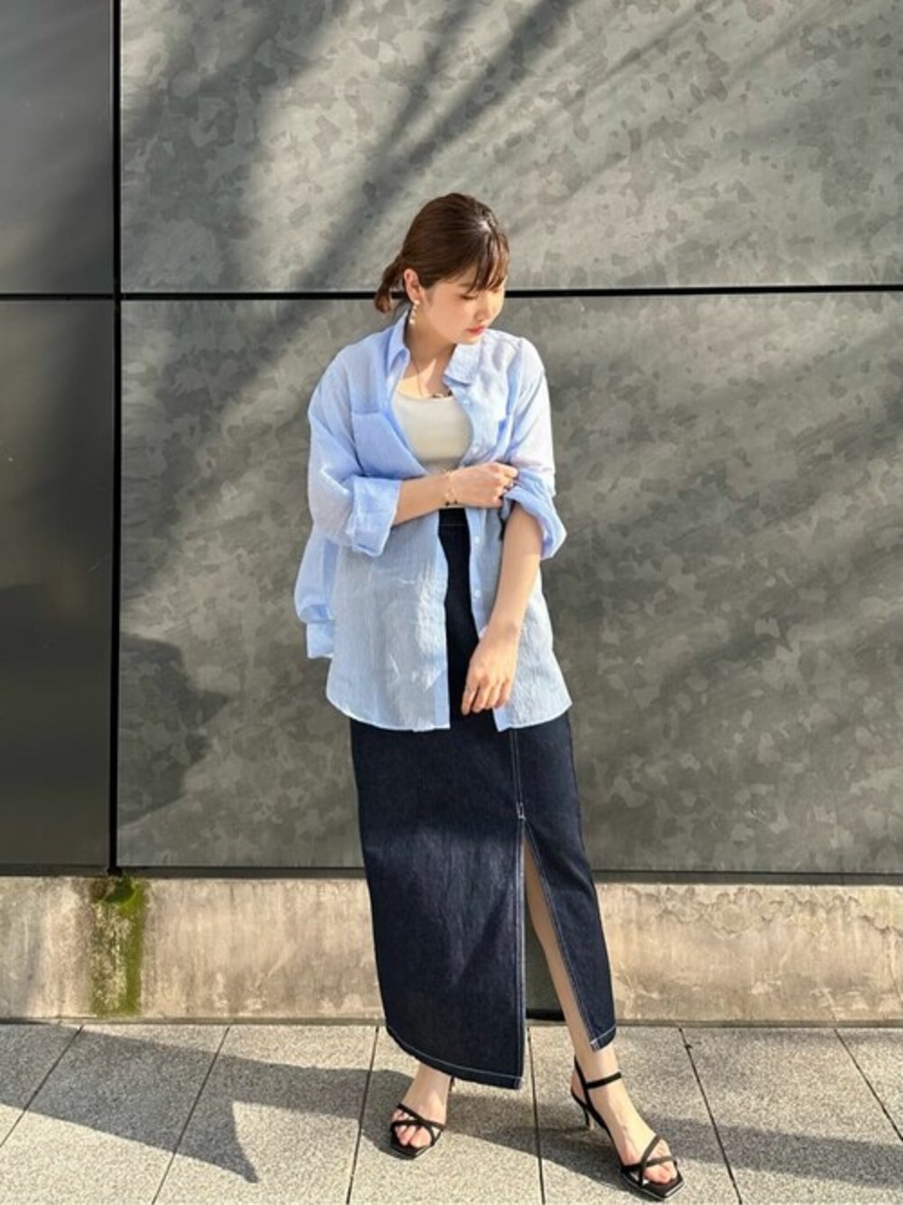 【POINT 】 春~夏にかけてピッタリなストライプシャツ。程よいシアー感とサラッとした素材感なのでインナー次第で春から真夏でも着心地よくお召し頂けます♪158cmでお尻がしっかり隠れる長めの丈感ですがサイドにはスリットが施されているので低身長の方でもバランスよく着れます♪ジャンパースカートのインナーやデニム合わせ等様々なコーデで楽しんで頂けます♡*****年齢20代前半/158cm/普通サイズM /パーソナルカラー:ブルベウィンター*****