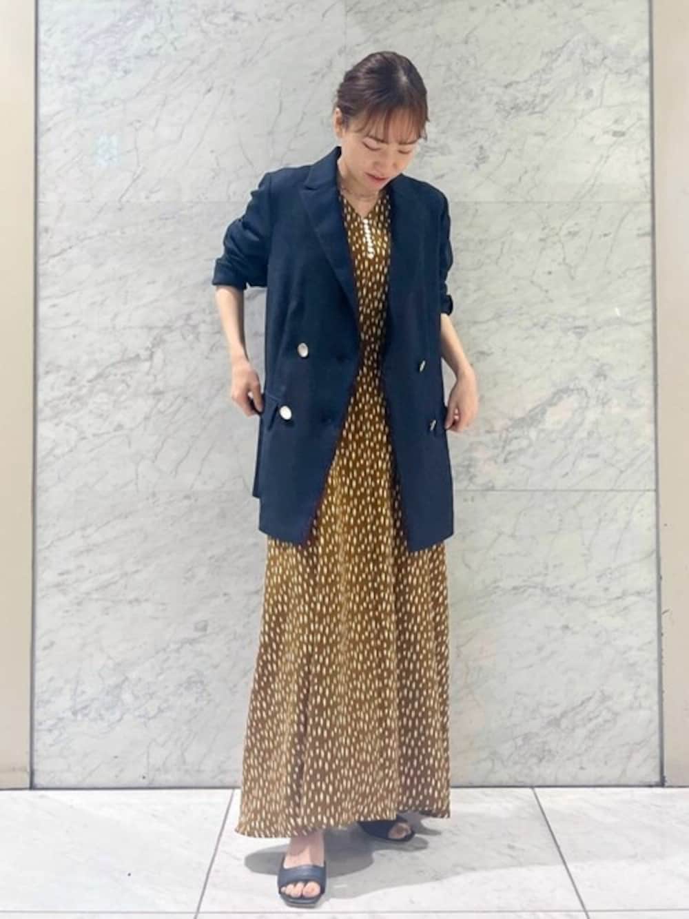 【ワンピース/Sサイズ着用】 印象的な柄が特徴のワンピース。 Vネックは程よい深さでインナーも見えないので安心して着られます。二の腕をカバーしてくれるパフスリーブも嬉しいポイントです。 生地も軽くサラサラとした肌触りで暑くなっても快適に着られそうです。 148cmでくるぶし丈なので小柄な方はヒールを合わせるのがオススメです。 【ジャケット/Sサイズ着用】 麻調の軽い素材でサラッと羽織れる人気のリスタビュールジャケット。148cmだとヒップが隠れる長さです。手首を出してスッキリ見せています。 **148cm/骨格ウェーブ/ブルベ夏**