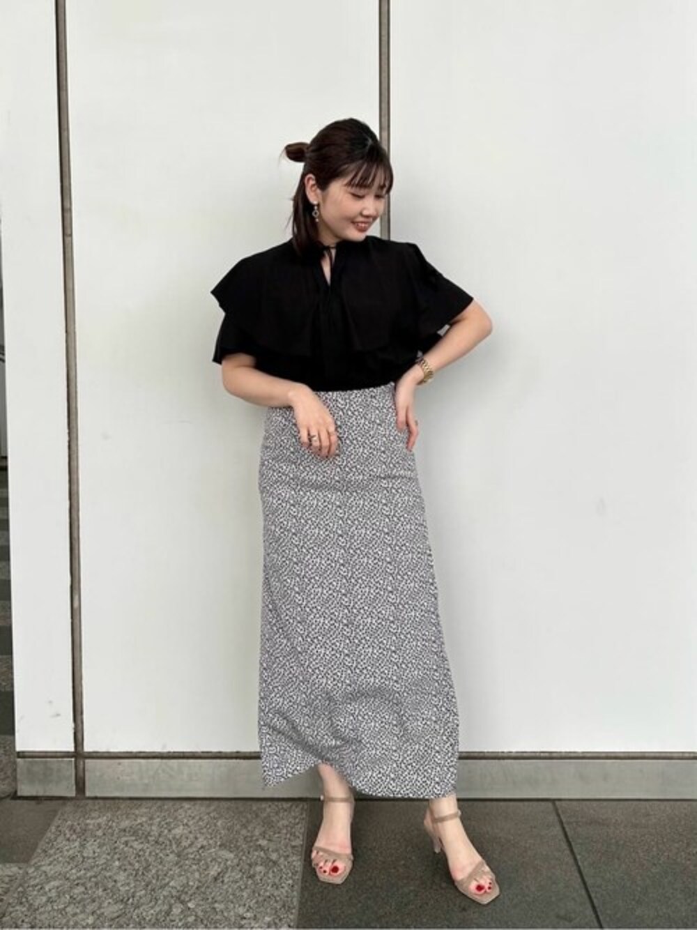 【ラッフルブラウス】 【素材感、着心地】 ポリエステル素材で生地にハリ感はありますが、薄手で清涼感があります。程よいラッフルデザインで甘くなりすぎず大人可愛く着れます♡ 【サイズ感】 Mワンサイズ。 身幅にはゆとりがあり窮屈感なし。骨格ストレートで二の腕にボリュームがあるデザインは苦手ですが柔らかい素材感で全く気にならなかったです♪ 【スタイリングポイント】 小花柄のナロースカートと合わせた大人フェミニンなコーデにしました♡足元もミュールサンダルでより女性らしさを出しました♡ ****年齢20代前半/158cm/普通サイズM /パーソナルカラー:ブルベ冬/骨格ストレート/足のサイズ:23.5*****