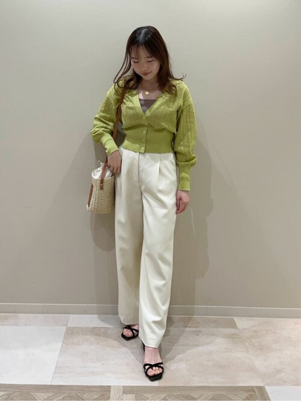 今の時期から夏にかけて活躍するアイテムを使ったキレイめな休日コーデです☺︎ドライタッチな生地なので肌あたりよく夏場も快適にお過ごし頂けます!タックが入っているので腰回りもカバー出来てスッキリとしたシルエットでお召し頂けます♪ウエストも後ろがゴムになっているので、サイズ感もフィットしやすいです!159cmで今回パンツはSサイズを着用しております!159cmくらいの身長の方はS.Mどちらでも着用出来るサイズ感かと思います☺︎ニットも透かし編みのカーディガンでノースリーブアイテムの羽織りとしても活躍できるので幅広く着こなしすることができます!