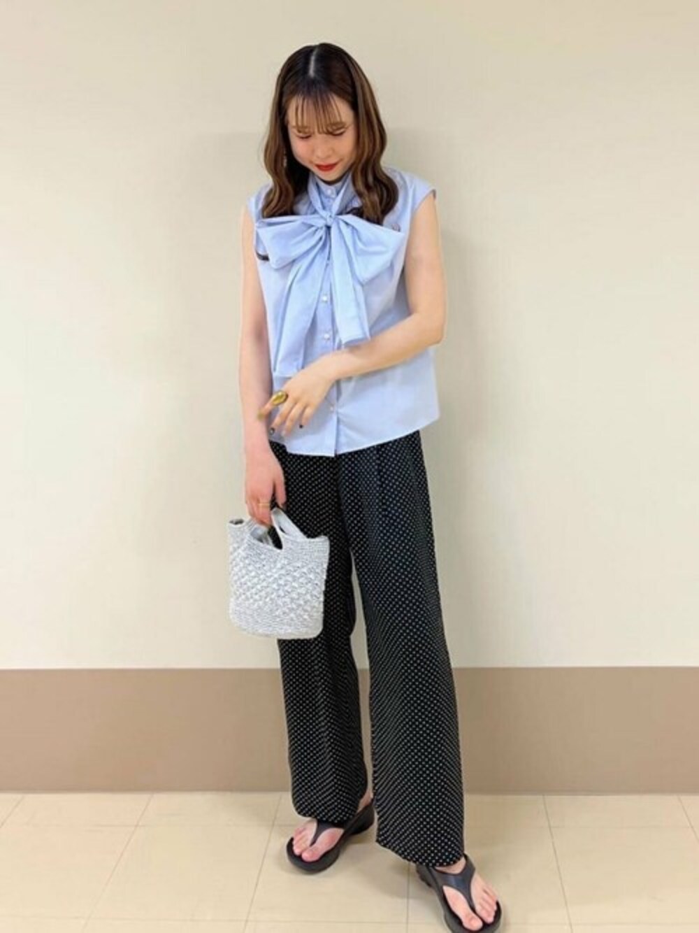 【ブラウスコーデ】大ぶりリボンが可愛いブラウスをリラックスパンツで合わせて見ました◎足元はサンダルで抜け感を!リボン取り外し可能ですので、様々なイメージ表情で合わせられます!ハリのある素材でリボンもカタチ作りしやすい所もポイントです!****年齢20代前半/身長166cm/普通サイズM.L/パーソナルカラーイエベ春/骨格ストレート****