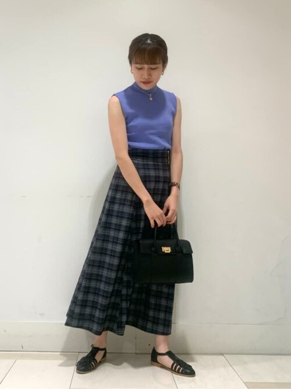 爽やかなブルーが目を惹く夏のお出かけコーデです☺︎ 存在感抜群のチェックスカートはAラインに広がるフレアなシルエットでスタイルも良く見えます!背面がゴムでハイウエストなデザインなのでスッキリとした印象に。 定番のノースリーブニットは柔らかい生地感でラインを拾いずらいので、夏も安心してお召し頂けます。