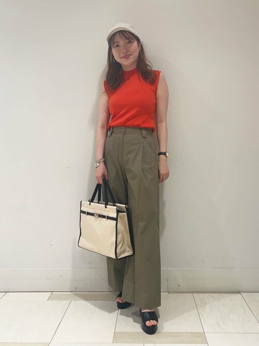 毎年定番の総針ニットを使った大人カジュアルコーデ✴︎サラッとした素材感は夏にピッタリで肩先にかかる袖感でスッキリと見せてくれます。今回はトレンドであるオレンジのカラーを合わせました!主役級のカラーになるので、ボトムスや小物はシンプルな色味で統一して日常使いできるようにしました!ボトムスもワイドなシルエットでタイトなトップスともバランス良く合わせられて、程よく肌離れしてるので夏場も風通し良く快適にお過ごし頂けます☺︎