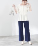 【ウエストタック麻調ブラウス】 【素材感、着心地】 サラッとした素材感でシワにもなりくいです。ホワイトは透け感があるのでインナーはホワイトかベージュがオススメ。 【サイズ感】 Mワンサイズ。ペプラムデザインなのでメリハリが付きますがバスト周りはゆとりがあり着やすいです。【スタイリングポイント】少しキレイめなブラウスをデニムと合わせた大人カジュアルスタイルに仕上げました♪かごバッグやヒールサンダルでお出かけ感も♡ ****年齢20代前半/158cm/普通サイズM /パーソナルカラー:ブルベ冬/骨格ストレート/足のサイズ:23.5*****