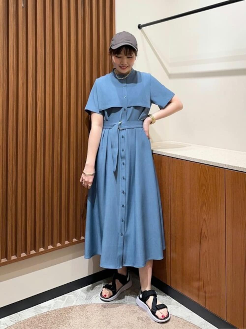 【素材感、着心地】 さらっとした素材感で清涼感あり。ウエストベルトで締め具合も調整できる為、窮屈感なく着れます! 【サイズ感】 Mワンサイズ、158cmの私で脛辺りの丈感なので長すぎることなくバランスよく着れます♪155cm以下の低身長さんでも問題なくお召し頂けます♡ 【スタイリングポイント】 ケープデザインのキレイめなワンピースをあえてキャップやスポサンで外して大人カジュアルなリラックススタイルに仕上げました♪ ****年齢20代前半/158cm/普通サイズM /パーソナルカラー:ブルベ冬/骨格ストレート/足のサイズ:23.5*****