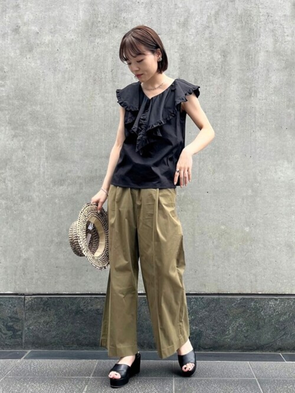 157cm / 骨格ウェーブ / ブルベ夏 【着用サイズ】ブラウス:M(フリー)、パンツ:S、サンダル:23.5 【普段サイズ】ブラウス:M(フリー)、パンツ:S、サンダル:23.5/M 《ブラウス》存在感のあるフリルがコーディネートを華やかにしてくれる1枚♡ 骨格ウェーブなのでトップスインは必須だと思っていましたが、こちらは丈が絶妙でアウトスタイルでもスッキリと決まります! 《パンツ》シンプル且つ美シルエットで、デイリーに使いやすいワイドパンツ◎ 程よくゆとりがあり、ボディラインが響かないのはもちろん通気性も良く夏にオススメです!柔らかいカーキの色味が、ベーシックな白や黒のトップスを合わせるだけでおしゃれに見せてくれます♪ 《サンダル》見た目はかなり厚底ですが、ストラップ付きで安定感があります◎ 店頭でも履いていますが、長時間の着用でも疲れにくいです!