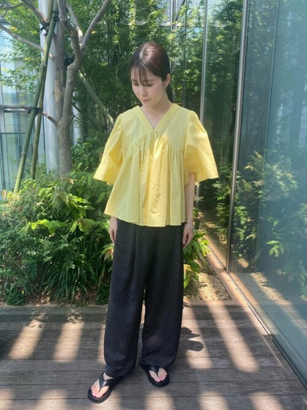 イエローのブラウスは1枚で存在感があります︎︎☺︎ 後ろ姿をかわいらしく見せるバックリボン付き♡ 袖は大胆なバラフライスリーブがポイントで、首元もVになっている為お顔まわりもスッキリと見せてくれます。 ドットのゆったりしたボトムと合わせ大人カジュアルのリラックスコーデにしてみました︎︎☺︎