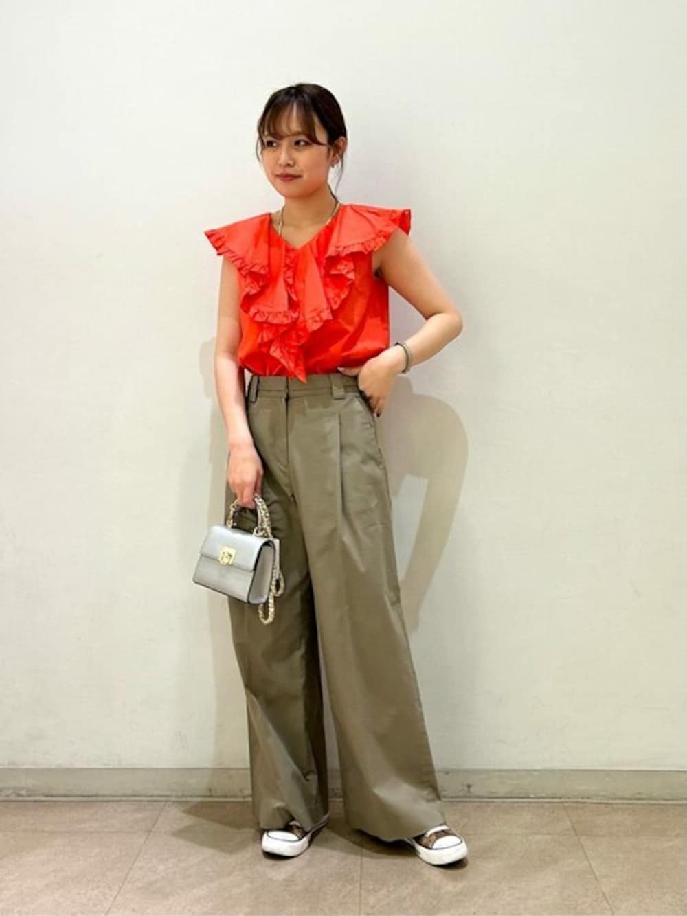 大きい襟がポイントのブラウスとリラックス感あるパンツで合わせて大人カジュアルを演出してみました♪ パキッと着映えするカラーがこれからの暑いシーズンにもピッタリです!
