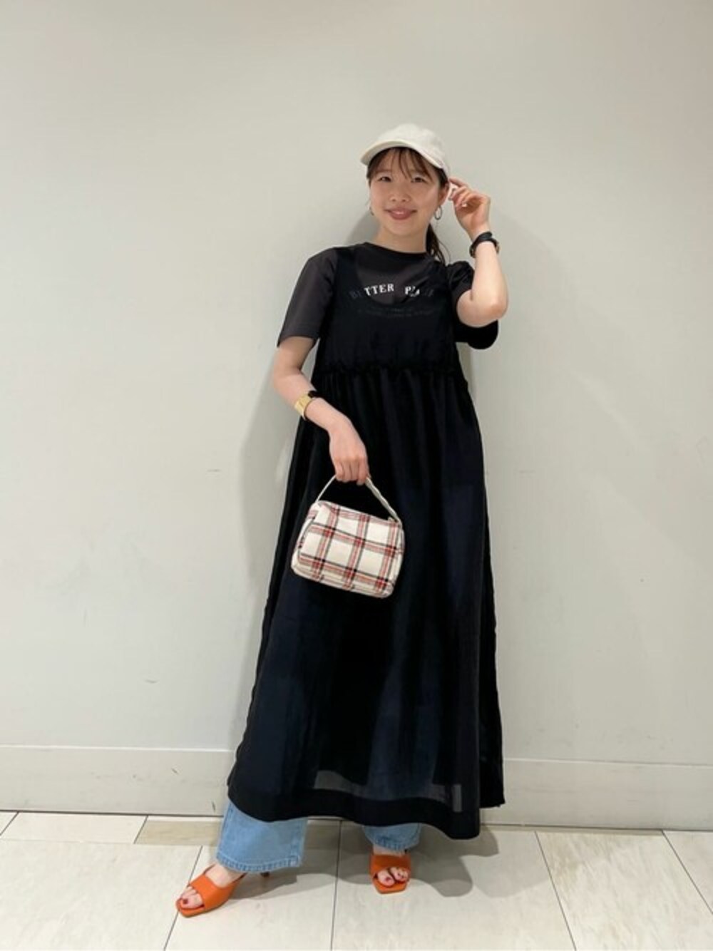 今年トレンドのシアー素材のワンピースを主役にした大人カジュアルコーデ☺︎難易度高めに見えますが、お手持ちのTシャツやタンクトップにデニムで合わせるだけでも◎ブラックでもシアー素材で透けがあるので重たくならず軽めな雰囲気に。159cmでくるぶししっかり見えるので小柄な方でも安心してお召し頂けます!