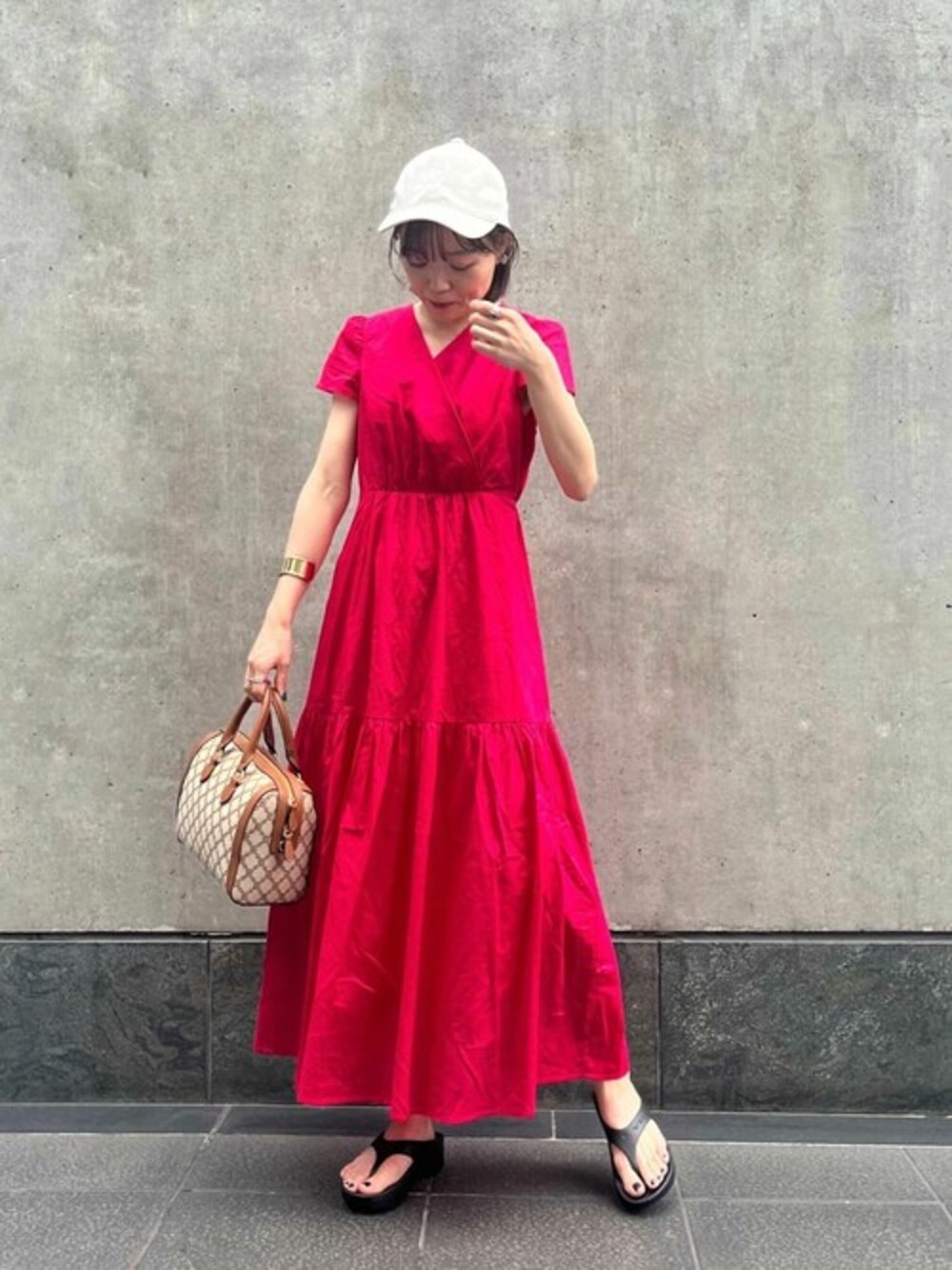 157cm / 骨格ウェーブ / ブルベ夏 【着用サイズ】ワンピース:M 【普段サイズ】ワンピース:S・M 《ワンピース》 素材・着心地:コットン100%で優しい肌触り。撮影した時は、雨が降る少し前で蒸し蒸しとしていましたが、さらりと軽くとても着心地が良かったです!袖にボリュームがあることで腕も細見えし、1枚でも安心して着られるデザインです◎ サイズ:157cmでMサイズ着用。N.の他のワンピースに比べると少し短めの丈です!足首が見えるので、ラフなサンダル合わせでもスッキリと見えます☻ウエスト周りの締め付けは強くなく、楽ちんな着心地です◎ 骨格ウェーブなので深く開いたVネックは苦手ですが、こちらはネックレスなどしなくても気になりませんでした♪ スタイリングポイント:1枚で主役級のカラーワンピースは、私なら旅行の時に着たいな〜と思い、リゾートをイメージして小物を合わせてみました♡