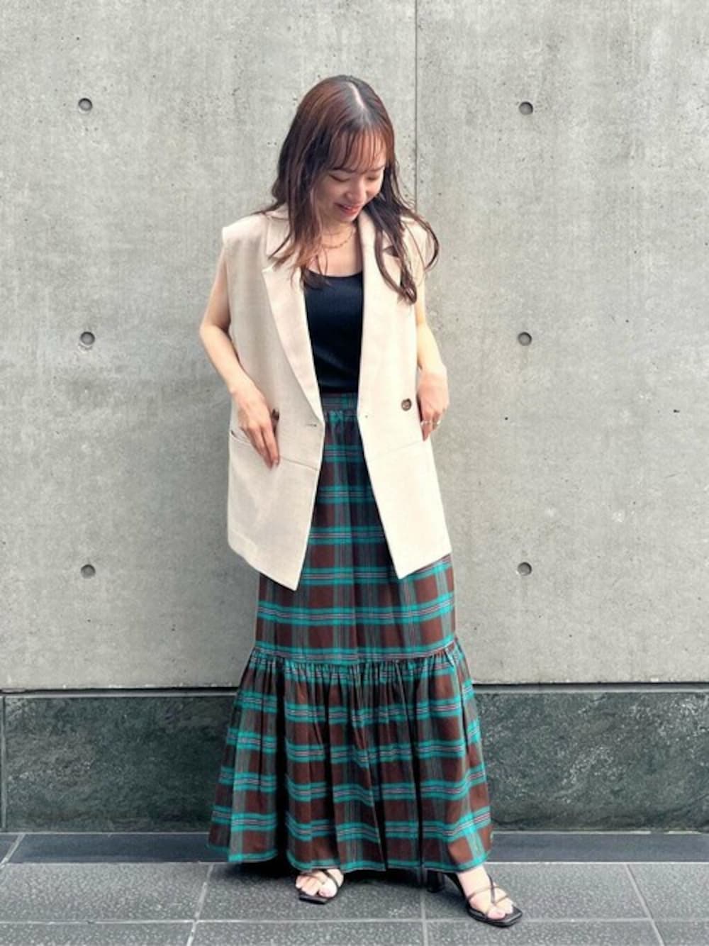 ☆☆ティアードチェックスカート☆☆ 【サイズ感】 148cmだとくるぶしが隠れる長さになります。写真はヒールのあるサンダルと合わせていますがスニーカーやフラットサンダルとも履ける長さです。 【着心地】 とても軽くリラックスした履き心地です。 肌離れもよいので暑い時期も快適に履けそうです。 【スタイリングポイント】 甘めなイメージになりがちなチェックスカートをジレとあわせて大人っぽいリラックスカジュアルコーデにしあげました☺︎ **148cm/骨格ウェーブ/ブルベ夏**