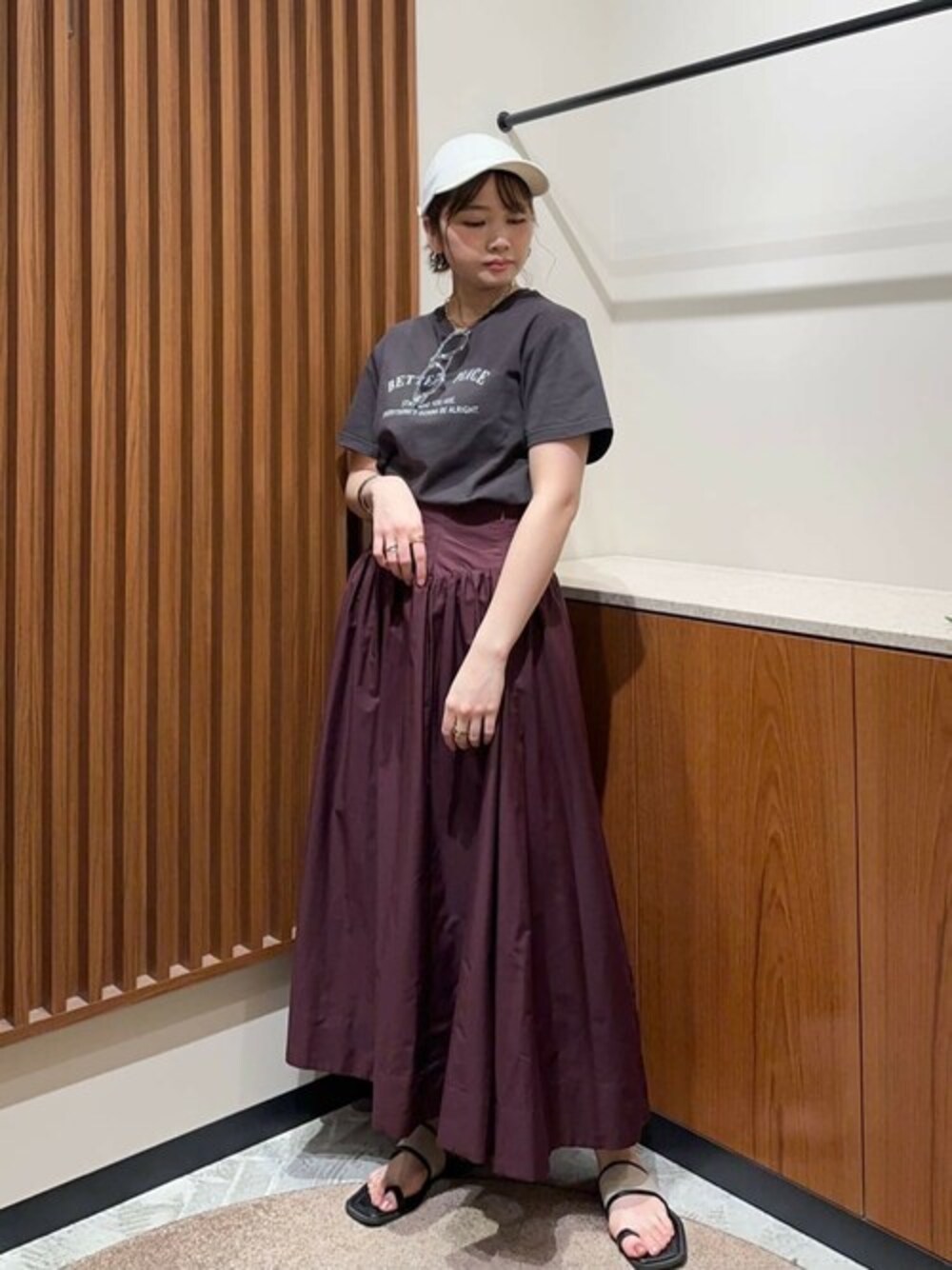 【アーチ切替ポプリンスカート】 【素材感、着心地】 少しハリのあるシャリっとした素材感です。 【サイズ感】 Mワンサイズ。158cmで足首少し上の丈感。太めのアーチ型のウエスト切り替えでスッキリ見えが叶います♩後ろはゴムで伸縮ありなので窮屈感なく着心地◎ 【スタイリングポイント】 ベーシックなロゴT合わせで休日のリラックスカジュアルコーデにしました♡ ****年齢20代前半/158cm/普通サイズM /パーソナルカラー:ブルベ冬/骨格ストレート/足のサイズ:23.5*****