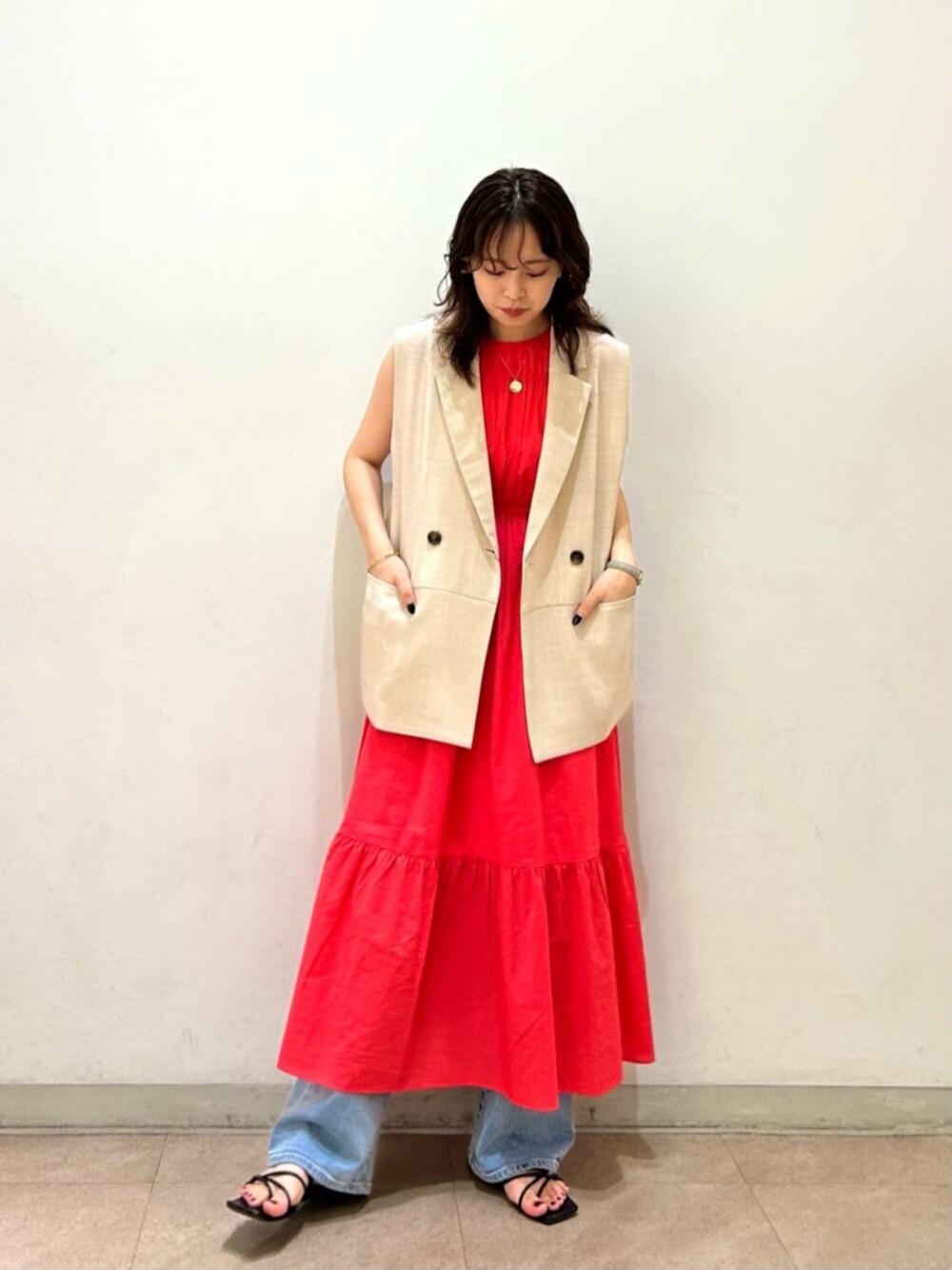 あえてデニムをレイヤードしたカジュアルスタイル☺︎ ジレはいつものスタイリングに一枚絵取り入れるだけでこなれた印象に早変わり♪ お手持ちのワンピースに重ねるのも可愛いですね!