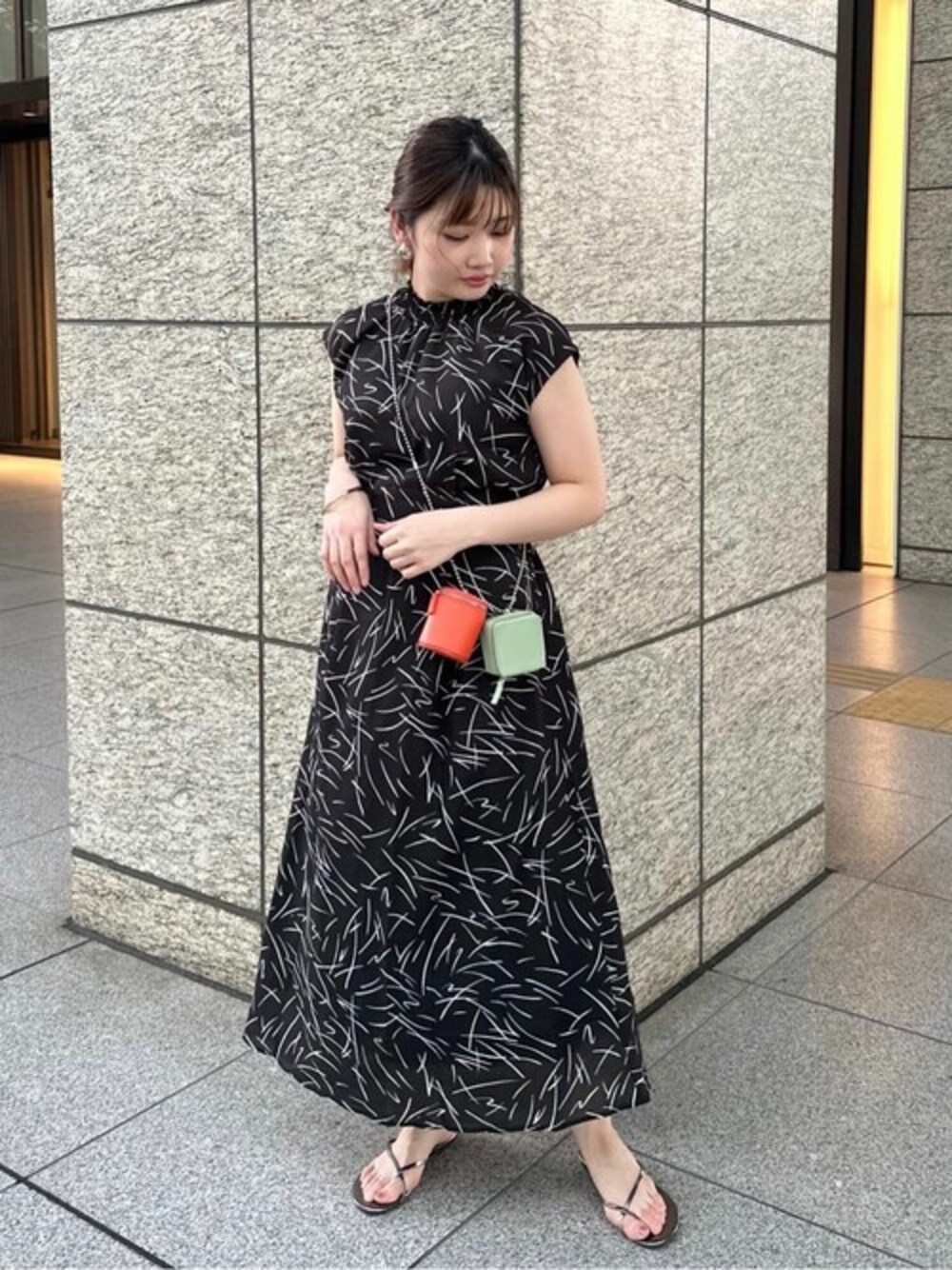 【モノトーンプリントワンピース】 【素材感、着心地】 つるっとした肌触りと軽やな素材感で真夏でも涼しくお召し頂けます♡首元はゴムでシャーリング仕様なので柔らかく窮屈感ないです◎ 【サイズ感】 158cm、Mサイズ着用で足首少し上の丈感です。ウエストはメリハリが付き、スッキリ見えますが後ろゴムで締め付け感なくお召し頂けます! 【スタイリングポイント】 少し詰まっている首元なのでアップスタイルにし顔周りをスッキリ見せました♪足元はフラットサンダルで外し大人カジュアルに仕上げました♡ ****年齢20代前半/158cm/普通サイズM /パーソナルカラー:ブルベ冬/骨格ストレート/足のサイズ:23.5*****