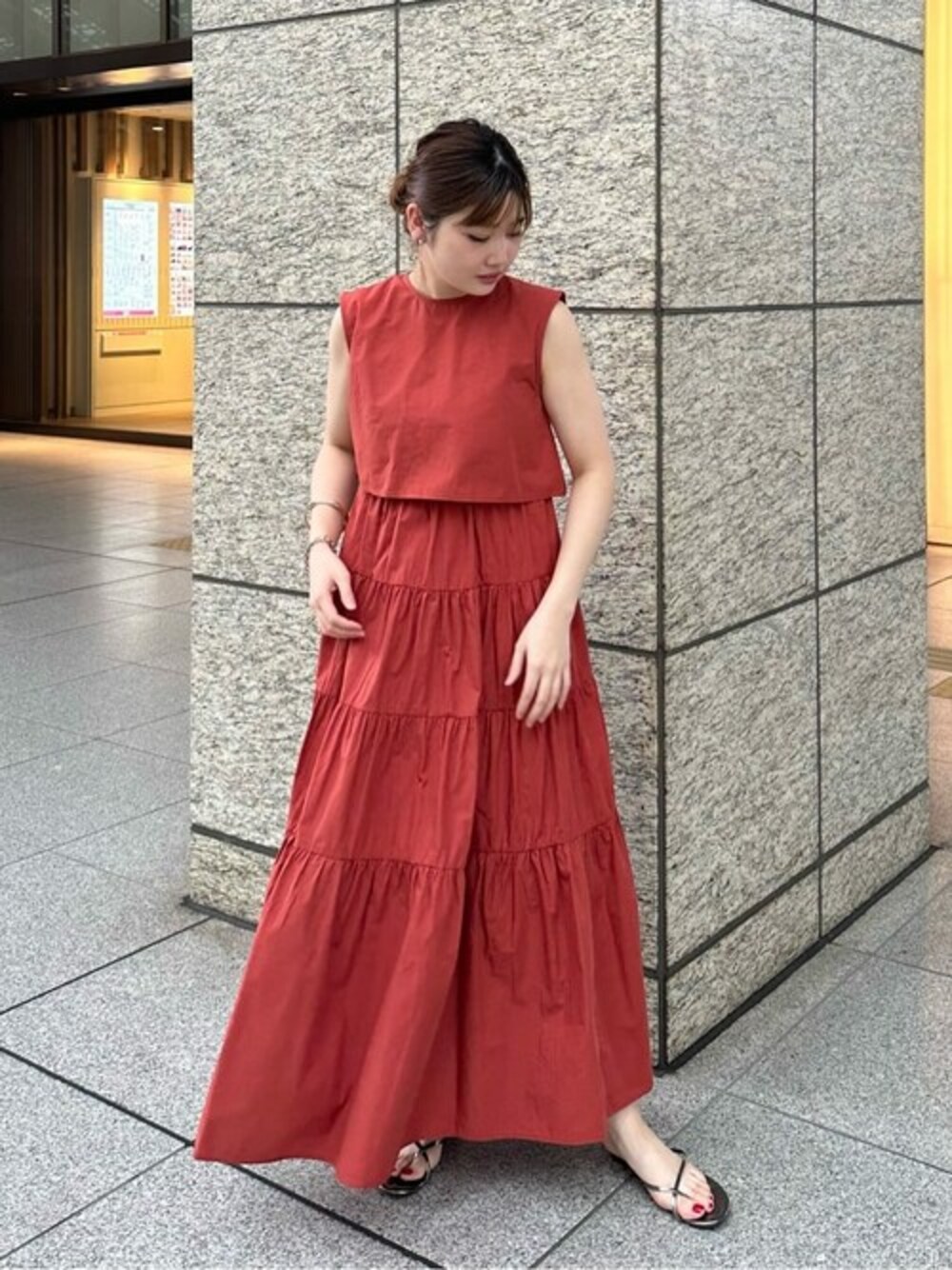 【レイヤートップコットンキャミワンピース】 【素材感、着心地】 コットン素材を使用しているのでベタつかず涼しくお召し頂けます♪ティアードのデザインで動く度に揺れ感やふんわり感を出せ大人可愛いくお召し頂けます♪ 【サイズ感】 158cm、Mサイズ着用で足首にかかる丈感です。肩紐は長さ調節できないので低身長さんはSサイズがオススメです♪ 【スタイリングポイント】 レッドで華やかさを出し足元はフラットサンダルで夏のお出かけコーデに仕上げました♡ ****年齢20代前半/158cm/普通サイズM /パーソナルカラー:ブルベ冬/骨格ストレート/足のサイズ:23.5*****