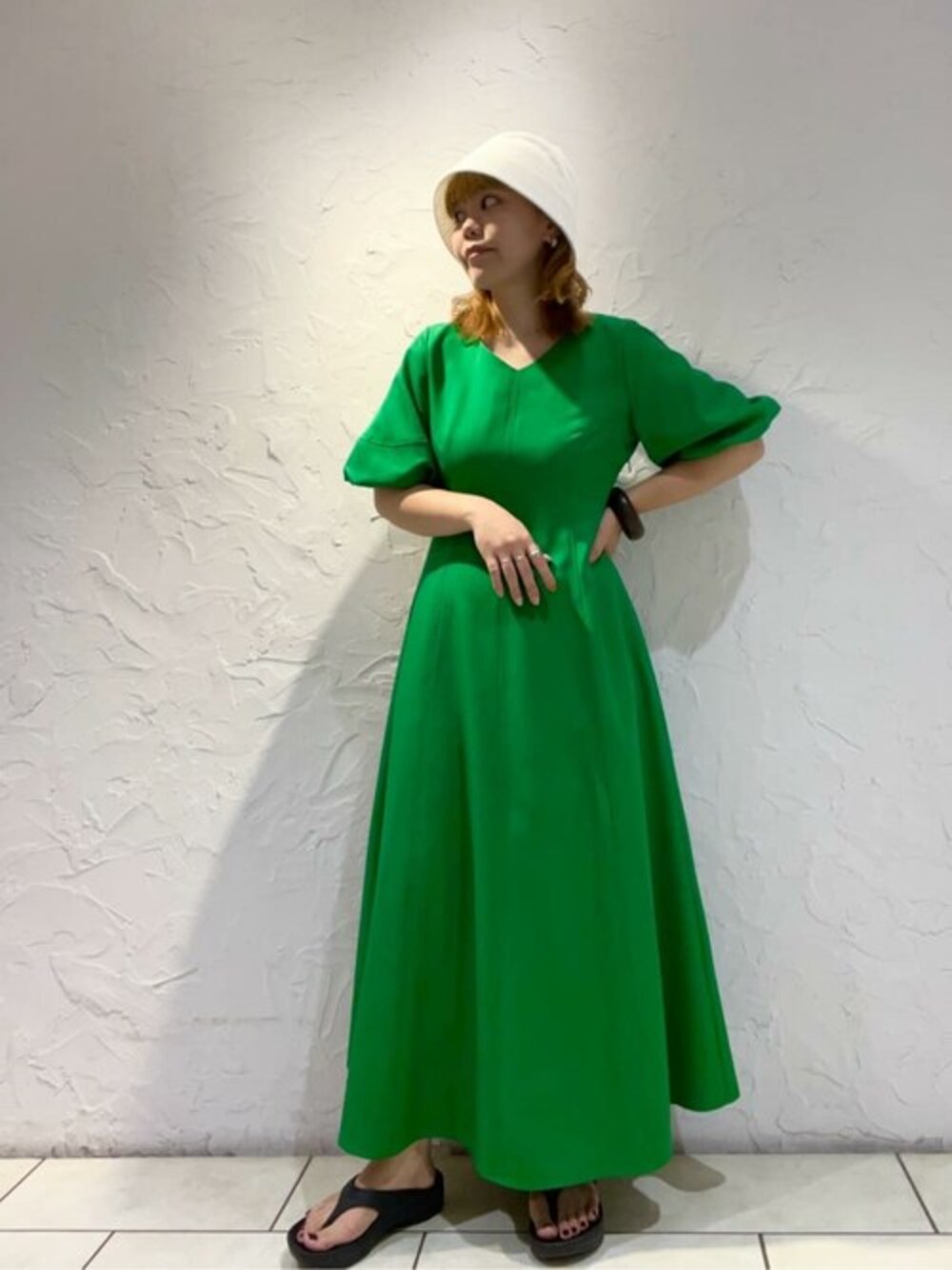 鮮やかなグリーンのワンピースが、一枚でパッと目を引きます☺︎サンダルと帽子でカジュアルな雰囲気で着るのがオススメです♡後ろはVネックで深めに開いていて、女性らしさがバックスタイルからも感じられます!