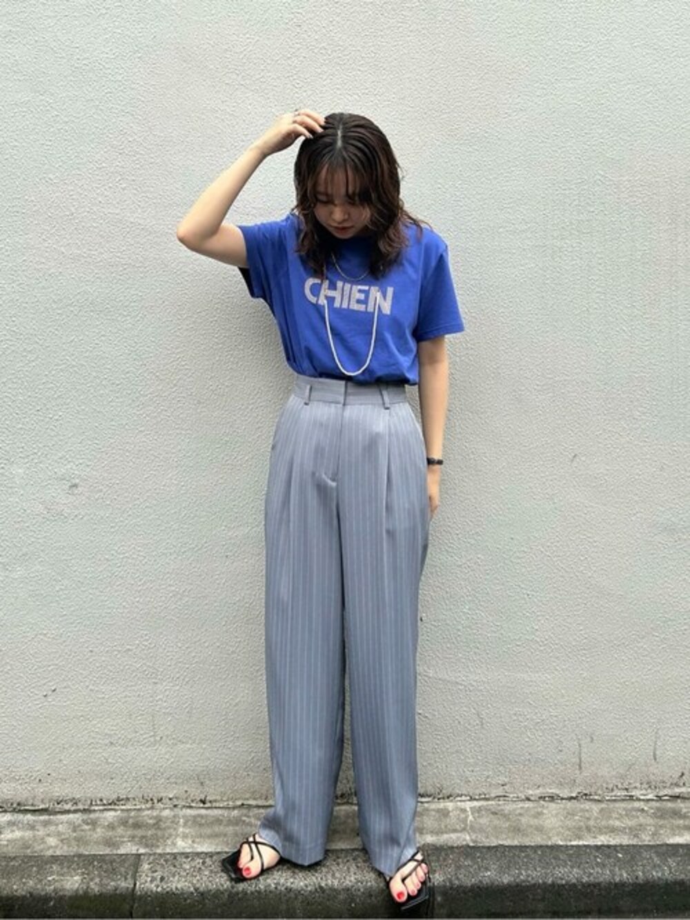 インスタライブにてご紹介したパンツをOFFスタイルにチェンジ!青×グレーのバランスでハンサムなスタイリングに仕上がります!センタープレスがしっかり入ってるので足を長く見せてくれるのも嬉しいポイント!フラットシューズでラフに着こなすのがオススメです♡