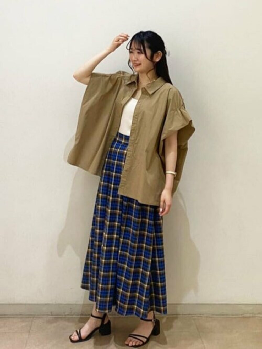 159cm.骨格ウェーブ.ブルベ夏. スカートSサイズ着用 ブルー×ブラウンのチェックスカートを主役に大人可愛いスタイルに仕上げました! チェックスカートは今時期から秋まで使えるアイテムでハイウエストなので脚長効果があります! またTシャツなどのシンプルなトップスと合わせても着映えする1枚です!