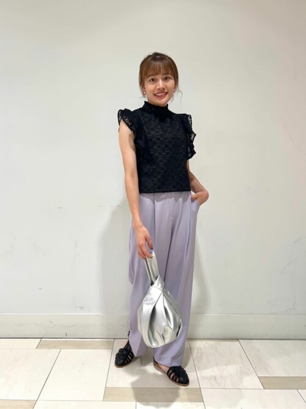 【着心地・サイズ感】繊細なレースが上品なブラウスは肩周りがフリルで着映えするデザイン。着丈もコンパクトなのでインせずお召しいただけるのでとっても楽です☺︎ パンツは身長161cmでSサイズで着用しています!普段はMですがややウエストにゆとりがあり、ワイドなシルエットなのでSでスッキリはくのがオススメです!☆☆ 【スタイリングポイント】デザインブラウスにパンツを合わせて甘さを抑えた大人のきれいめスタイルにしてみました。淡いパープルは派手すぎないカラーなので普段色物を着ない方でも挑戦しやすいのでオススメです!