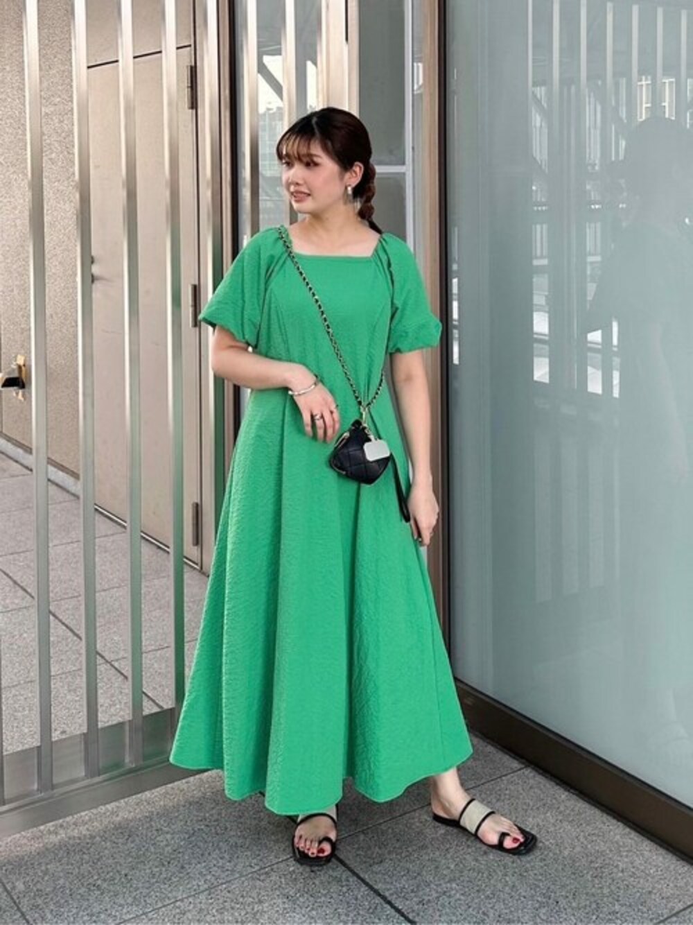 【バックリボンパフスリーブワンピース】 【素材感、着心地】 凹凸感のある素材感です。ボリューム袖ですが首元はスクエアネックで開いているので顔周りもスッキリ見え、落ち感のあるシルエットで楽ちんにお召し頂けます♡ 【サイズ感】 Mワンサイズ、158cmで足首にかかる丈感です。バストや身幅も切り替えなく程よいゆとりがあります。 【スタイリングポイント】 バックスタイルまで可愛いので1枚で着映えします♡フラットサンダルを合わせて夏のリラックススタイルにしました♡ ****年齢20代前半/158cm/普通サイズM /パーソナルカラー:ブルベ冬/骨格ストレート/足のサイズ:23.5*****
