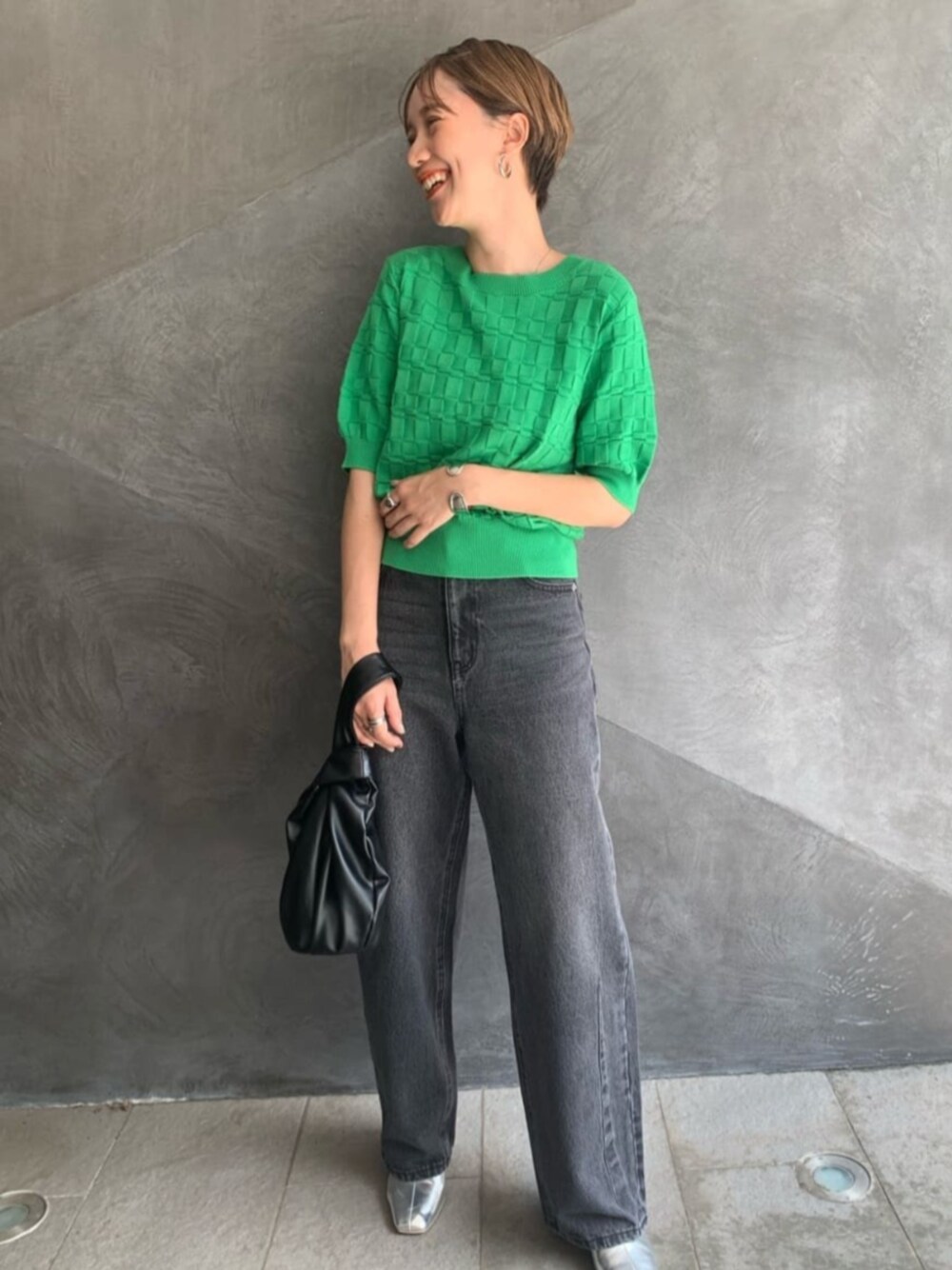 シンプルですがブロック編みのカラーニットにレッグラインが美しく映るカーブデニムを合わせて"半歩先行く"コーディネートを意識しました。アクセサリーや足元のブーツは繊細な華やかさが演出できるシルバーで合わせています。今シーズンから取り入れられるスタイリングなので一押しです♪