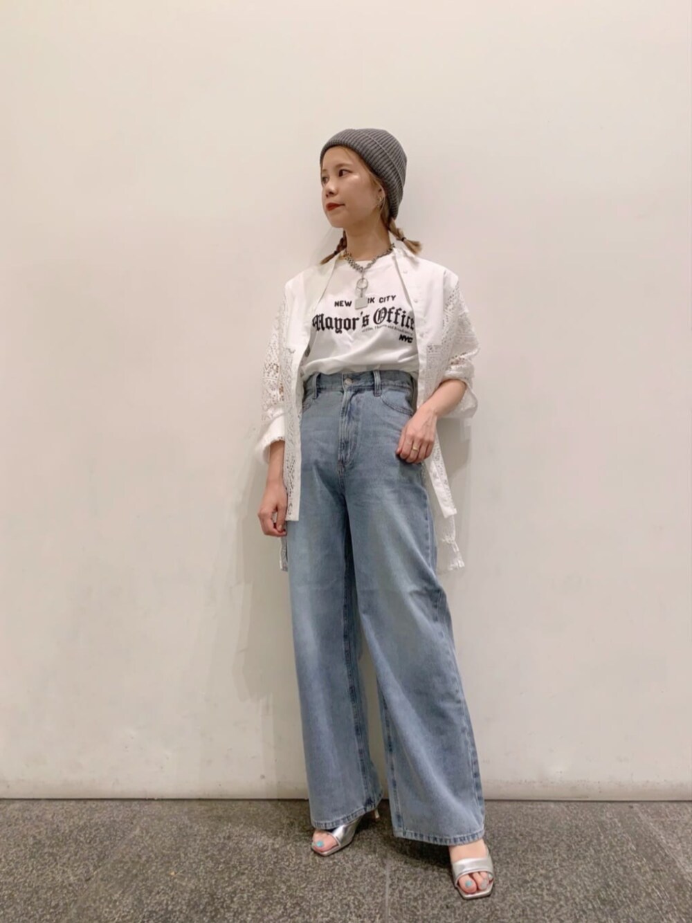 N.のデニムはハイウエストでスタイルが良く見えるので、おすすめです。 着用のカラーがなんば店では1番人気です。 156cm Sサイズ着用で写真くらいの着丈になります。