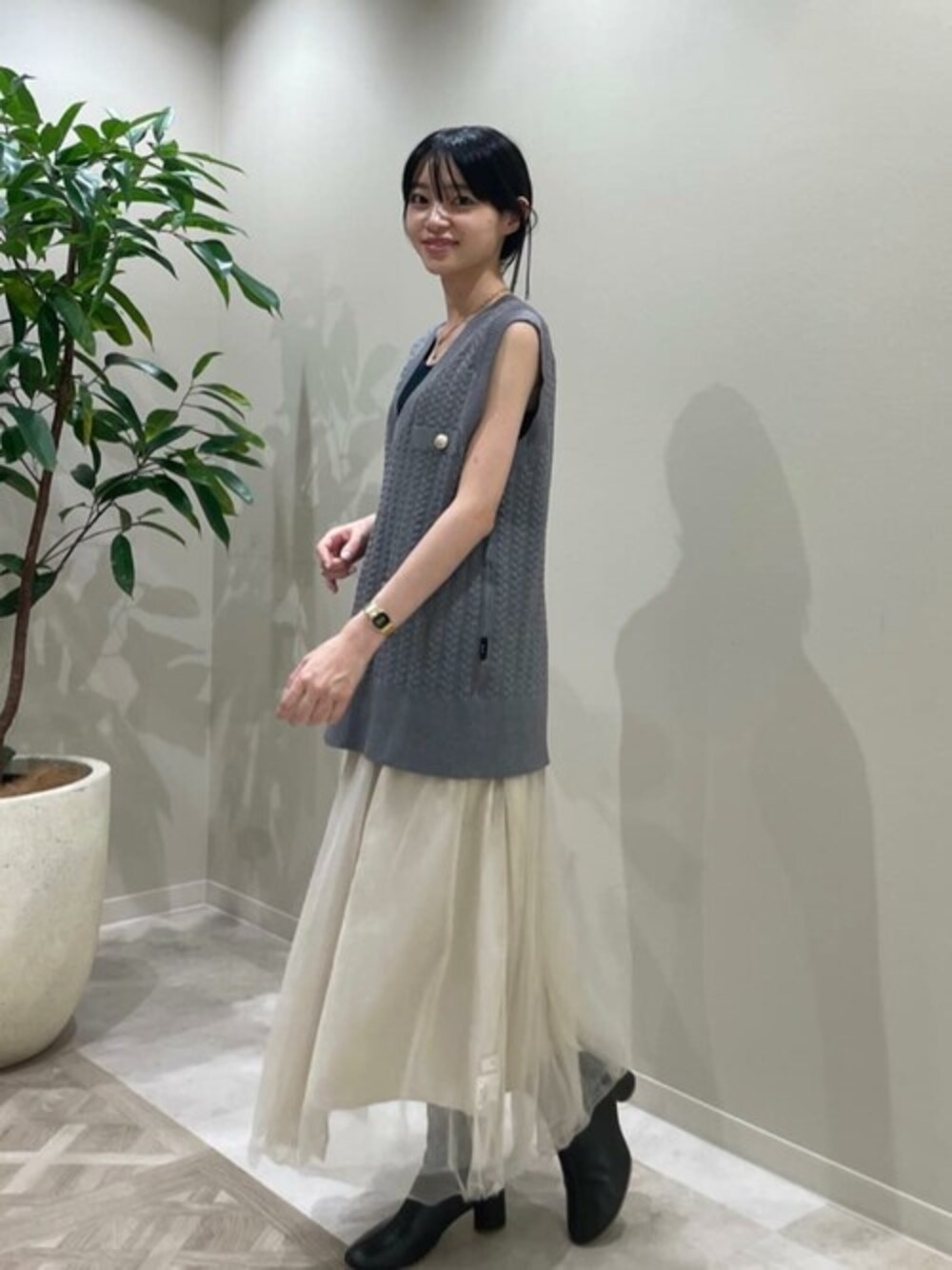 【ニット】シーズンを選ばず着回しできるニットジレはケーブルとゴールドボタンでクラシカルな印象に♩グレーだとカラーやモノトーンと色んなコーデに馴染みます⌾ 【スカート】今期注目のチュールアイテム。長すぎない丈感で小柄な方でもブーツとのバランスも軽やかに取り入れられます!