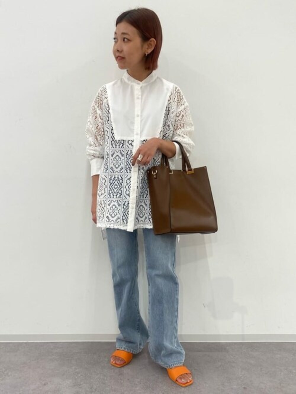 新作のレースシャツを使ったスタイリングです! ロングセラーのナチュラルフレアデニムを合わせたレース×デニムの鉄板スタイリングなので、小物でカラーを取り入れました☺︎ [着用サイズ] トップス:M ボトム:S