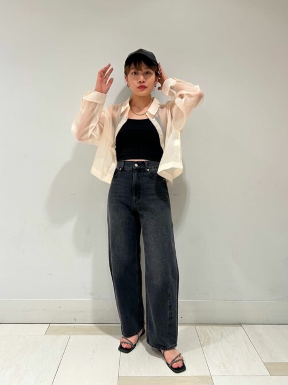 【着心地・サイズ感】ショート丈シャツはサラッとした肌あたりで着心地も抜群です☺︎ デニムは裾にかけて緩やかにカーブされたデザインで、お腹周りや太ももカバーしてくれるのでスタイル良く見えます! 【スタイリングポイント】レザーキャップで秋素材を取り入れたメンズライクなスタイリングにしてみました。インナーに短丈のキャミを合わせて肌見せしたのもポイントです☆