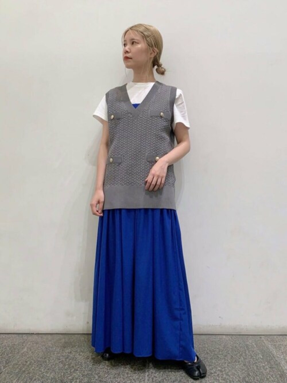 目を惹くブルーのキャミワンピースをスカート風にレイヤードしてみました。 ジレ、ベストは今季注目のアイテムなので、 早めにgetされるのがおすすめです!