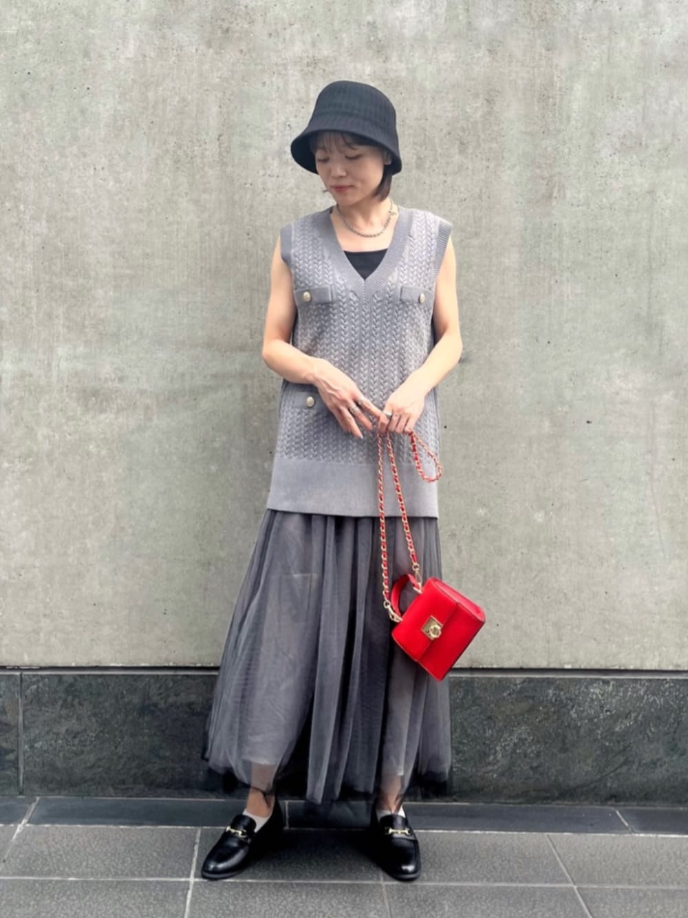 157cm / 骨格ウェーブ / ブルベ夏 【着用サイズ】トップス:M(フリー)、スカート:M(フリー) 【普段サイズ】トップス:M(フリー)、スカート:S〜M 《トップス》 素材・着心地: ケーブル編みの立体感がとても可愛く、デニムや無地のパンツなどと合わせるだけでコーデが完成する嬉しいニットベスト♪暑そうに見えるかもしれませんが、意外と軽い肌触りで、まだ暑い時期からサラッと着ることができます! サイズ感:身幅、腕周り共にゆとりがあり、張り感のあるシャツもレイヤードできるサイズ感です◎ 胸元のスッキリVネックは少し広く開いているので、上半身が華奢な骨格ウェーブさんはハイネックインナーやネックレスを合わせるのがおすすめです♡ 《スカート》 素材・着心地:透け感のあるチュールがとにかくかわいい!横に広がらず、スッキリとしたシルエットで大人な雰囲気で着こなせます◎インナーペチコートは取り外しができるので、デニムにチュールだけ重ねるのもおすすめです! サイズ感:フリーサイズ。157cmでインナーペチコートはふくらはぎの上くらい、スカートは足首が見えるくらいの丈です。 N.の他のカジュアル系スカートに比べると短めの丈で、秋にブーツと合わせた時にもバランスよく着用できます☻