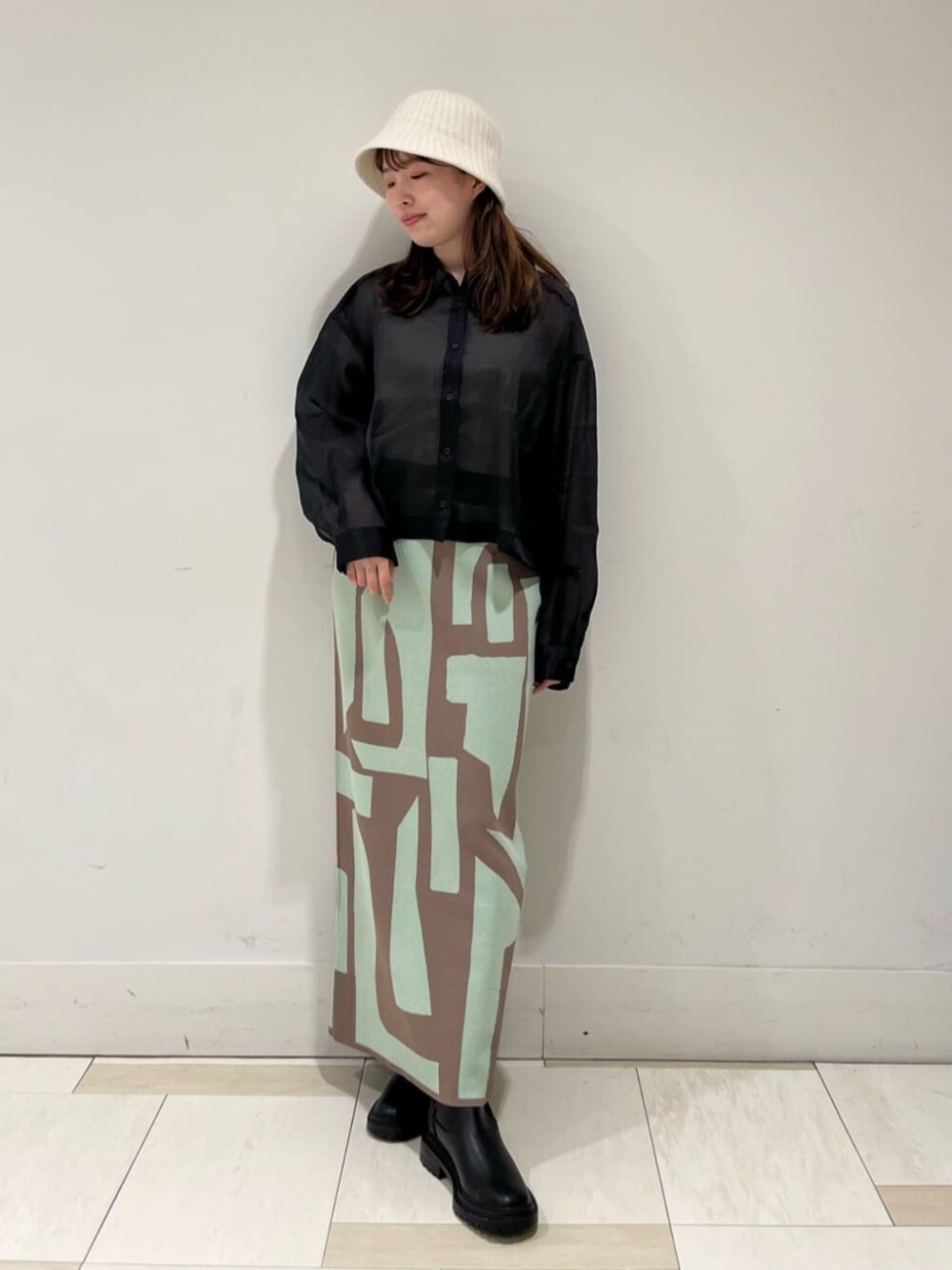 スタイリッシュな晩夏スタイルに☺︎スカートは前回入荷時もとても人気で新色を今回着用しております!柔らかな配色なので大きな柄もキツくなりすぎず、馴染みよく履けます。ニットスカートでも腰回りのラインを拾いにくい為、安心感もあります。159cmでくるぶしがやや見えるくらいなので、少し長めの丈感になります。今回はロングスカートにシアーショートシャツを合わせて、バランス良く見えるような合わせ方をしております!今時期からAW先取りしたい方は、シアートップス取り入れると雰囲気が出るのでオススメです!