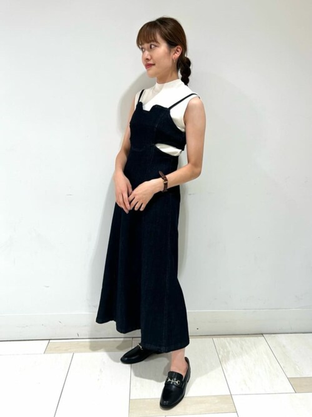【着心地・サイズ感】両サイドがカットオフされたデザインがウエストくびれて見せてくれます!♡程よくフィット感があるのでシアートップスやコンパクトニットなど軽めなインナー合わせがオススメです。 【スタイリングポイント】ジレを合わせたトレンド感ある大人カジュアルコーデにしてみました。モノトーンでまとめてモードっぽさをプラスしているのがポイントです♪
