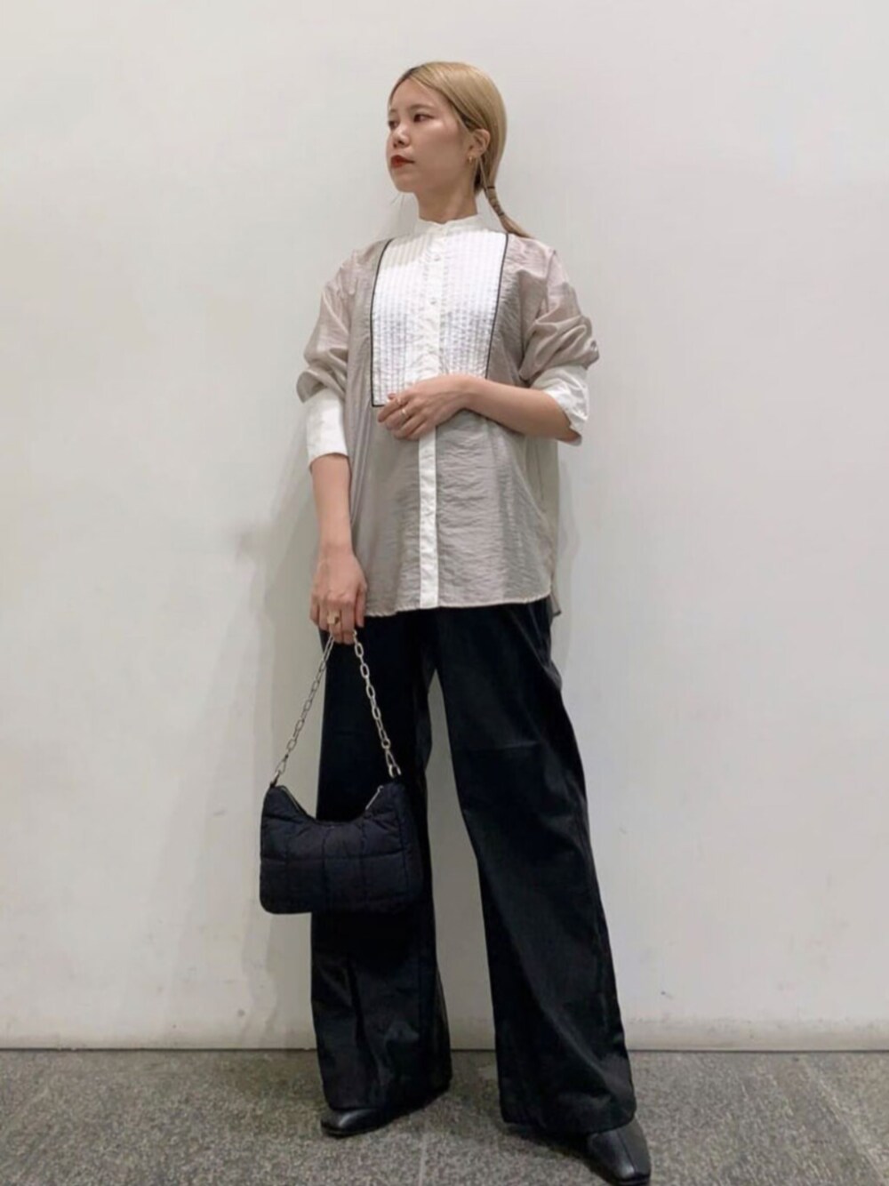 一枚でおしゃれ感の出るブラウスです。 羽織りとしても着用して頂けます。 パンツは156cmでMサイズ着用、ヒールで合わせて丁度良い着丈になります。