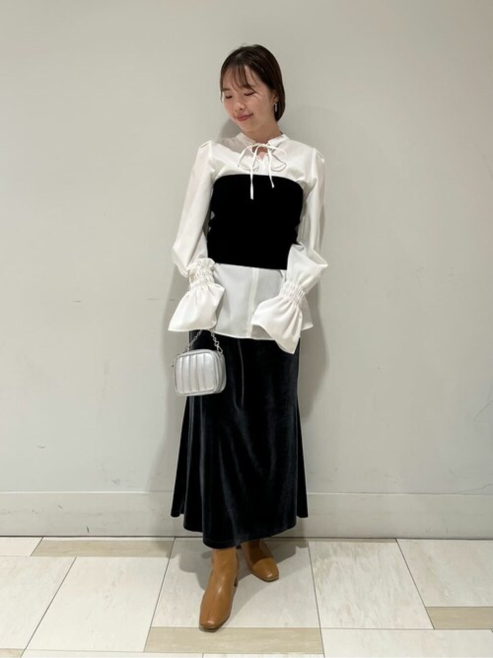 今季トレンドのベロア素材のスカートは控えめな光沢がとても上品でデイリーに使いやすいのでベロア初挑戦の方でも安心してお召し頂けます。ビスチェと合わせてより、上品でモードな雰囲気のコーデにしております。ウエストは切り替えが太めなので自然なスタイルアップを叶えてくれるのも嬉しいポイントです。159cmで今回全てMサイズ着用です!