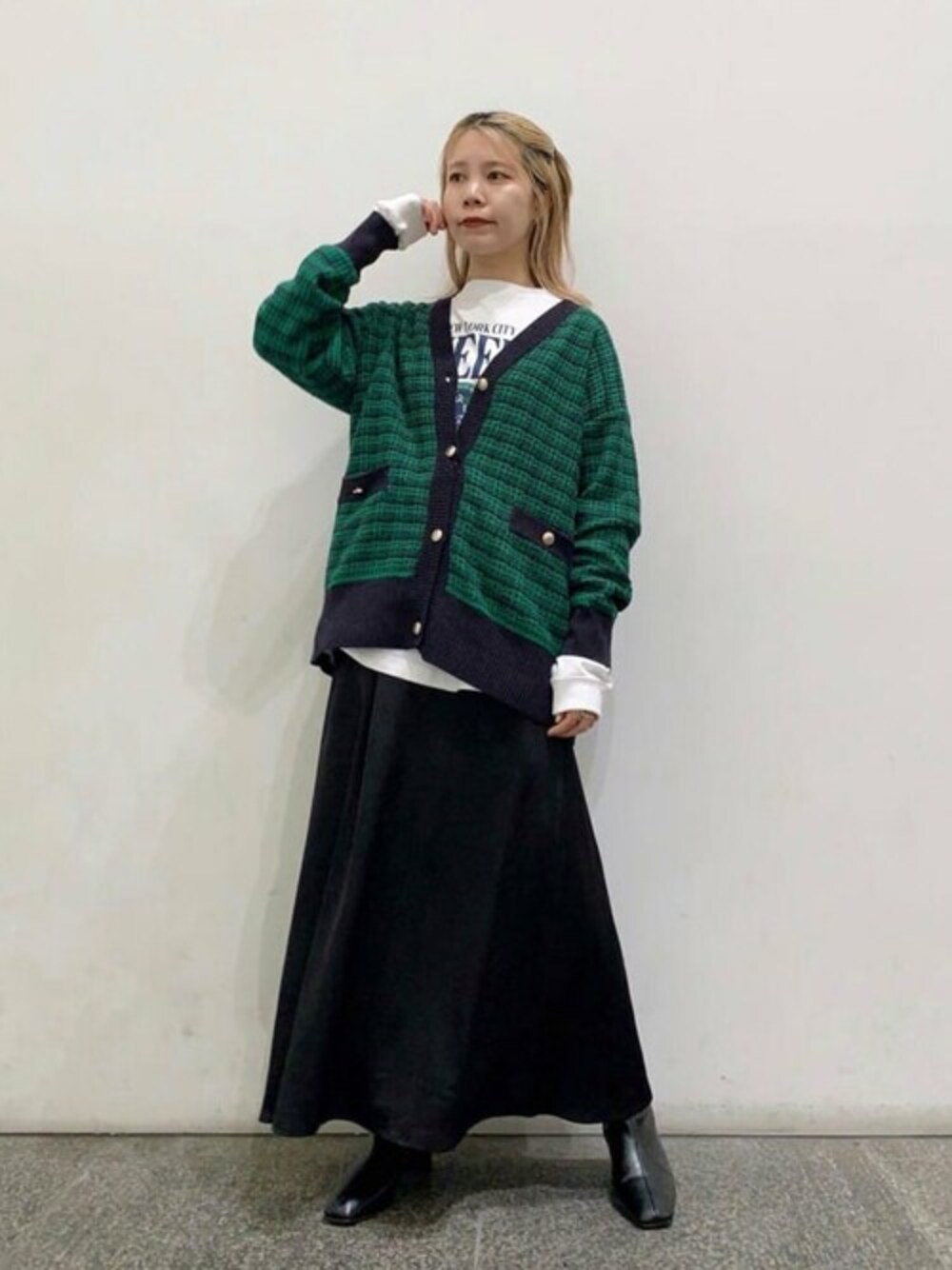 ツイード×ゴールドボタンが大人かわいいカーディガンは一枚で存在感バッチリです。 ロンTでカジュアルダウンさせましたが、タンクトップ肌見せで、抜け感を出してもかわいいですし、肌寒くなるとタートルニットを入れるのも良しです。