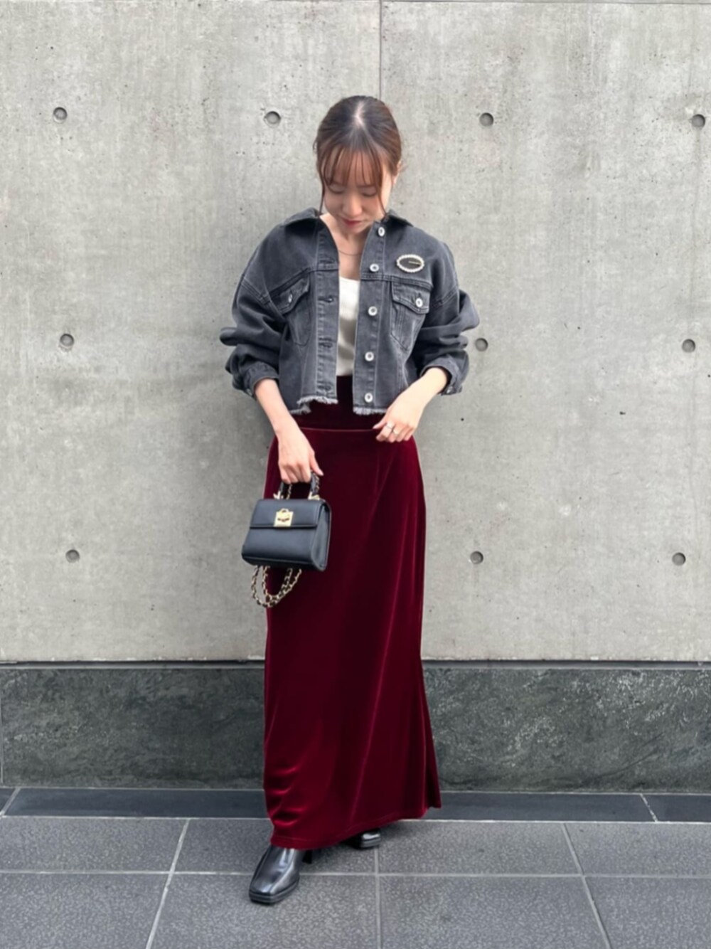 ☆☆Gジャン☆☆ 【サイズ感】 Sサイズ着用。骨盤あたりのショート丈で小柄さんや骨格ウェーブの方にもおすすめです! ☆☆スカート☆☆ 【素材】 高級感たっぷりのベルベット生地は一枚で主役に♪ 裏地なしで肌触りはサラサラしています。 【サイズ感】 Mサイズ(フリーサイズ)着用。ウエストは少しゆとりがありますがズレる感じはありません。 長さは148cmだとロング丈です! **148cm/骨格ウェーブ/ブルベ夏**